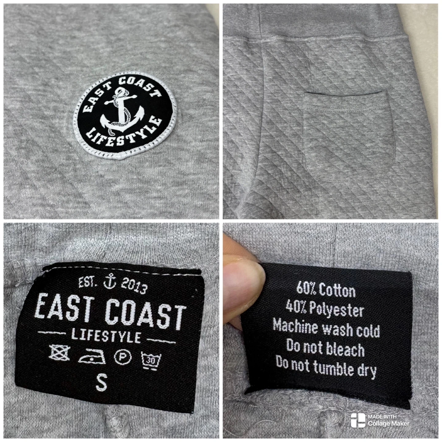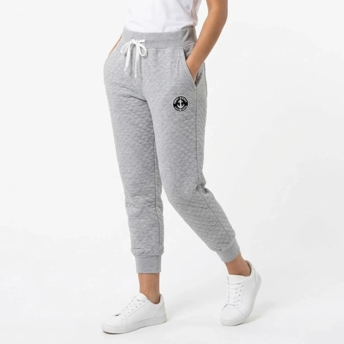 These cozy grey sweatpants feature a unique quilted diamond pattern and a relaxed, oversized fit. They are designed with a comfortable elastic drawstring waistband, ribbed cuffs, pockets and an East Coast Lifestyle anchor logo patch on the hip.