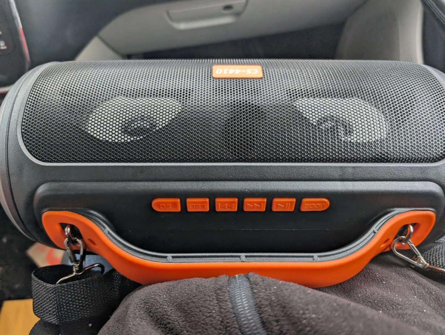 This is a portable CS-4410 Bluetooth speaker. It's black and orange with integrated controls. Includes a detachable strap for easy carrying.