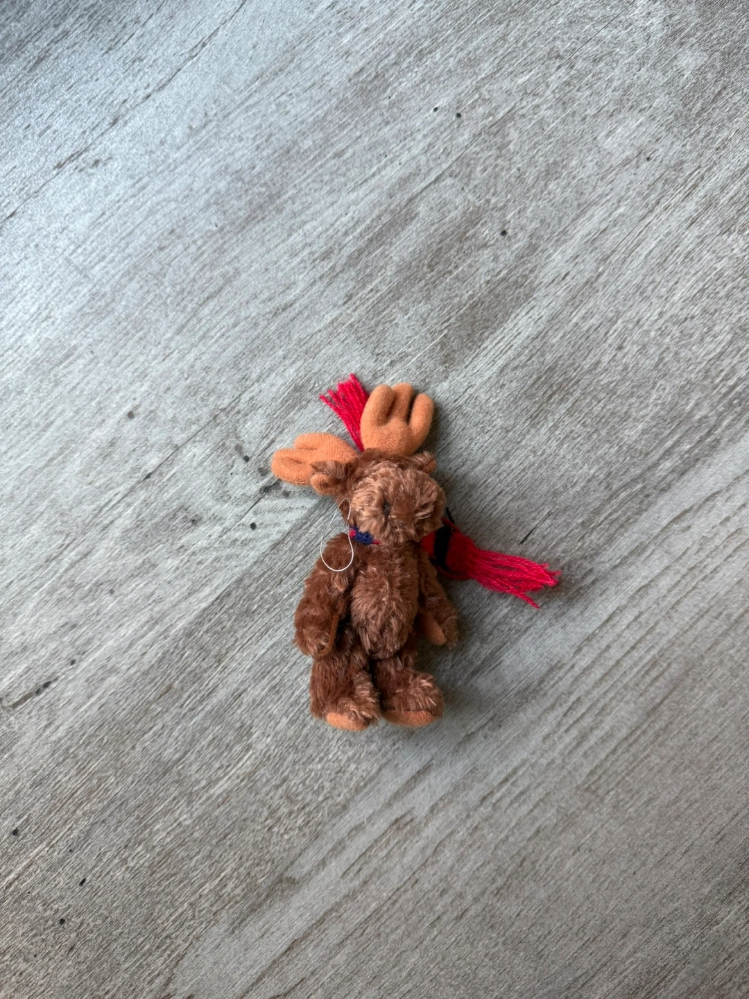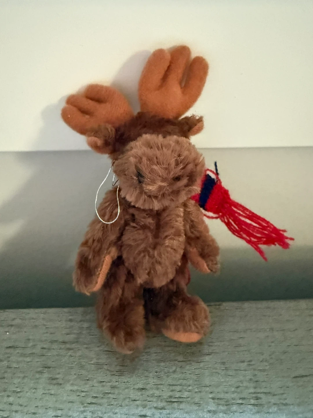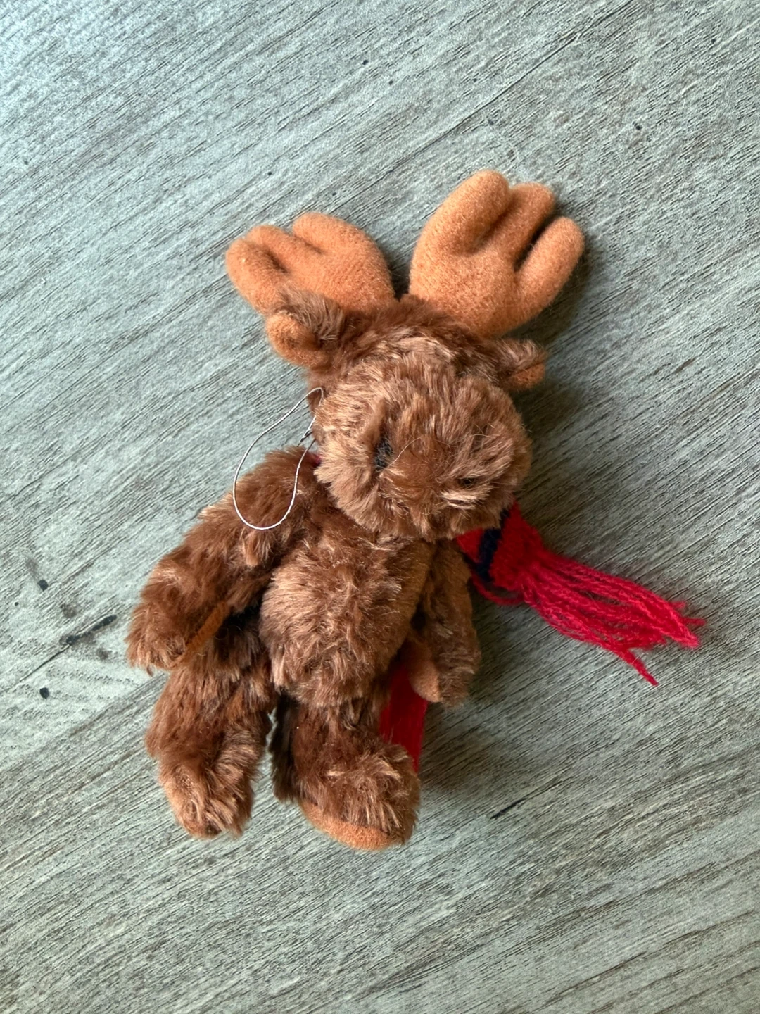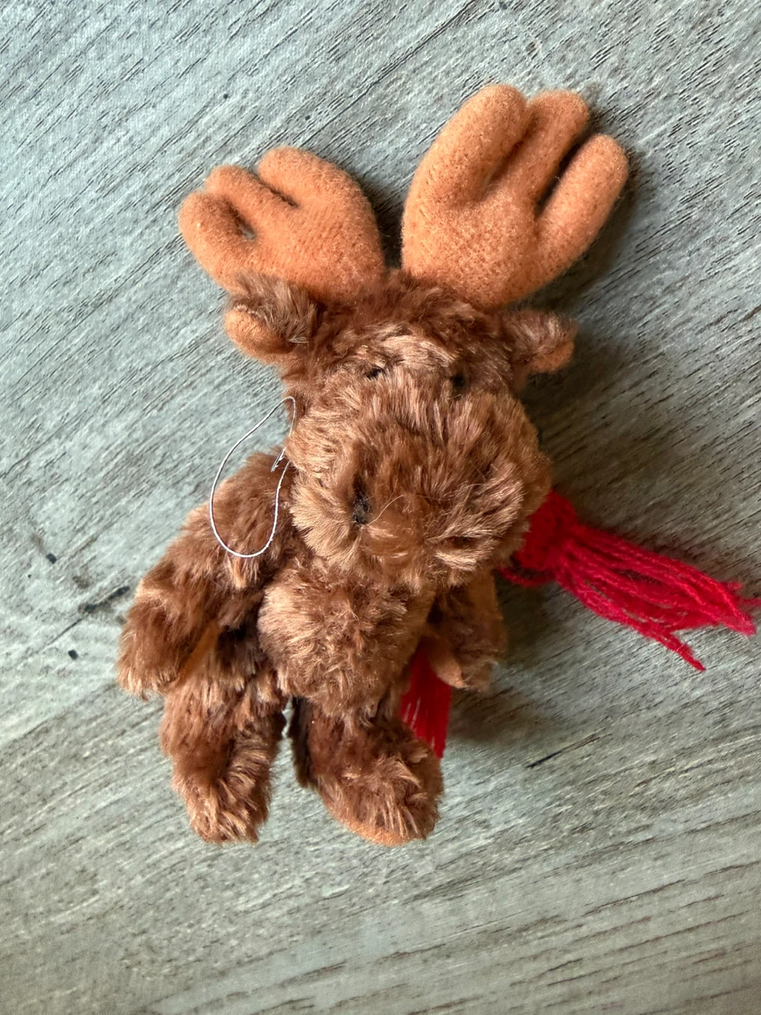 This is a small, fluffy plush moose ornament. It has orange antlers and a red yarn scarf. It's made of soft brown material. This little guy would make a cute addition to holiday decor!