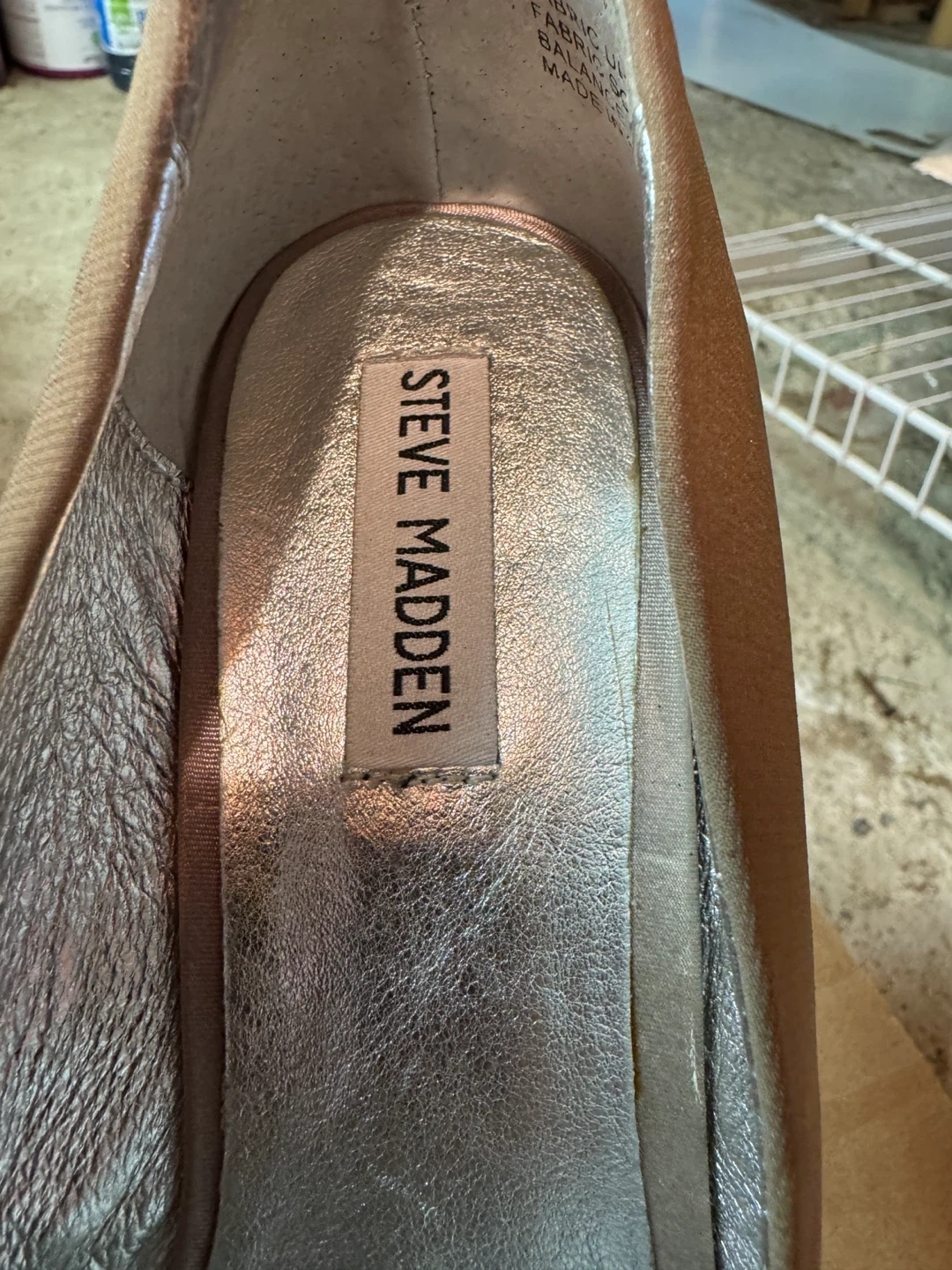They feature a fabric upper and fabric sole with a metallic heel and platform. Made in China.