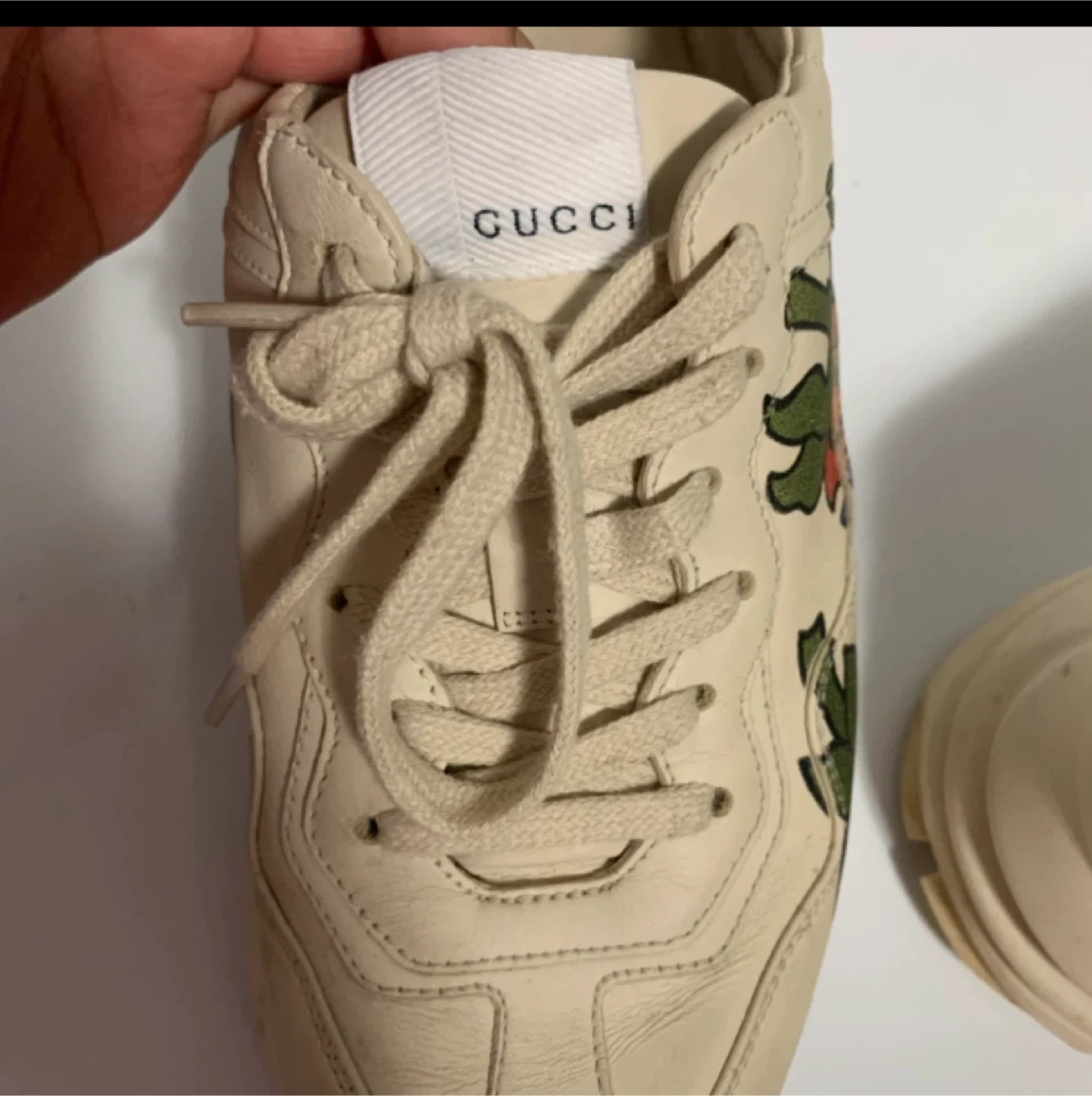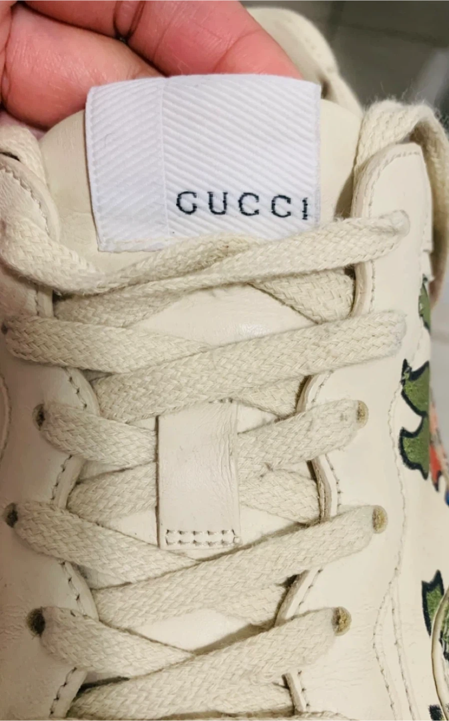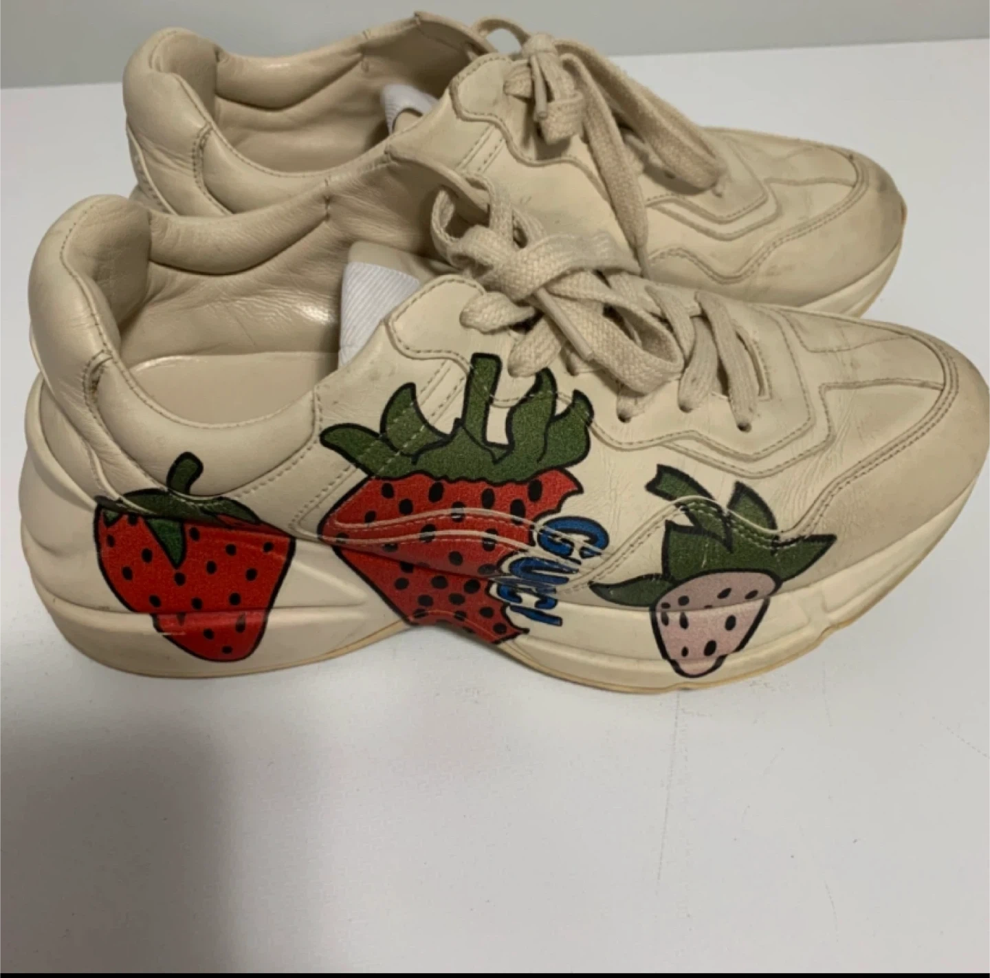 Cream leather Gucci Ace sneakers with embroidered strawberry detailing. Lace-up closure. These kicks are super stylish!