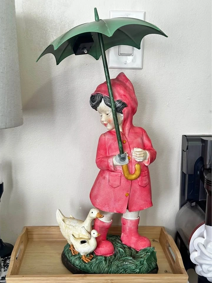 Whimsical statue of a little girl in a red raincoat and boots, holding a green umbrella (broken hand). Has two cute ducks (1 missing a wing) at her feet. Umbrella has a light underneath using solar power. Great for garden or indoor decor.