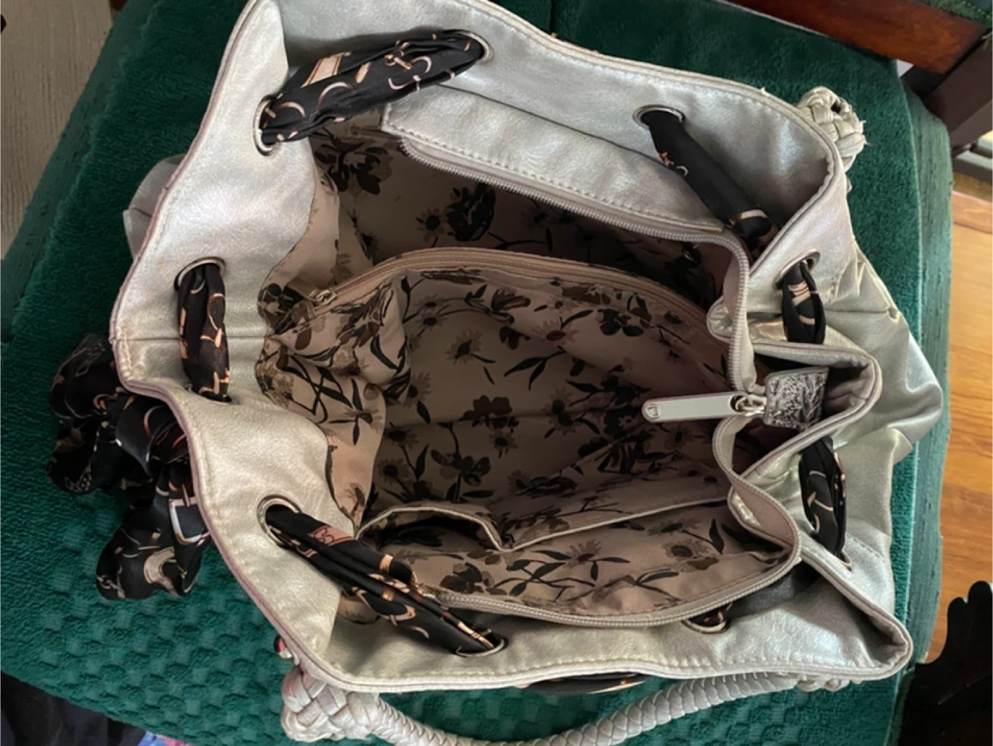 This is a pre-owned silver purse that's both stylish and functional, perfect for adding a touch of sparkle to any outfit. The bag features a unique key embellishment and braided handles. The purse contains a patterned lining with multiple pockets and a zippered closure, blending fashion with practicality.