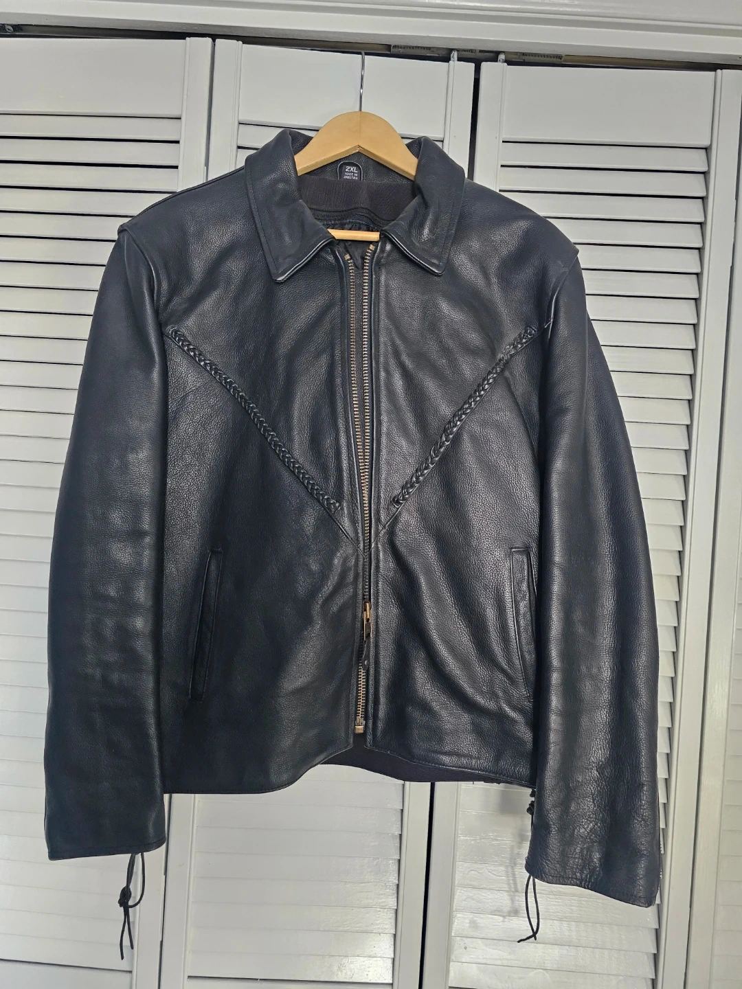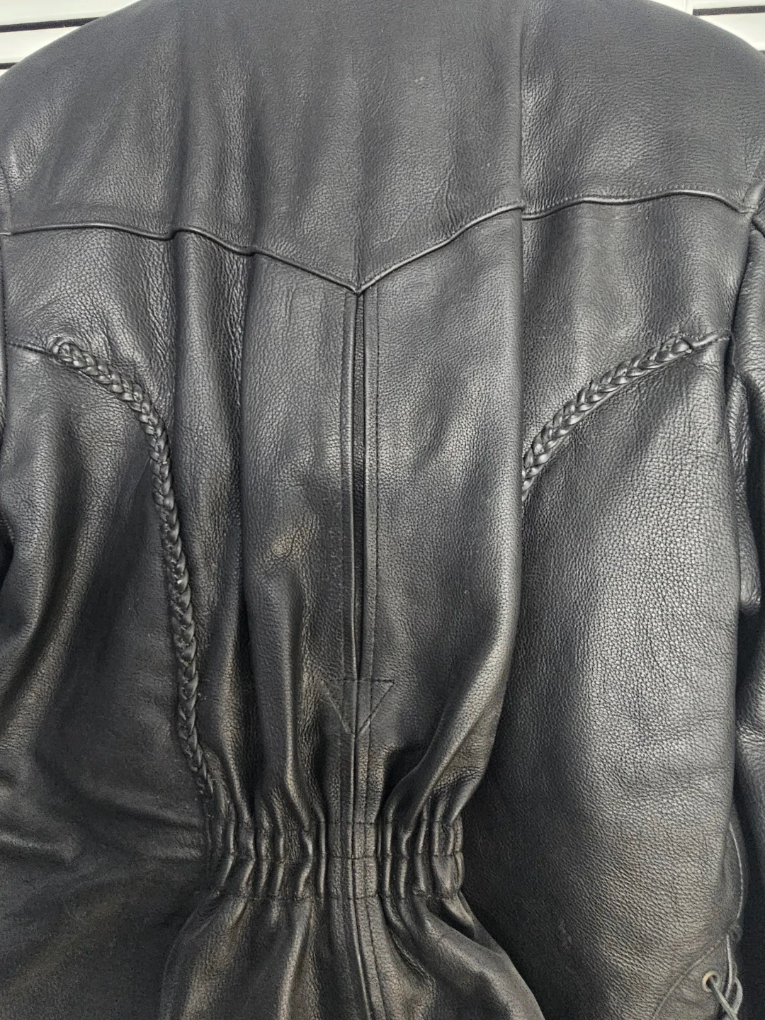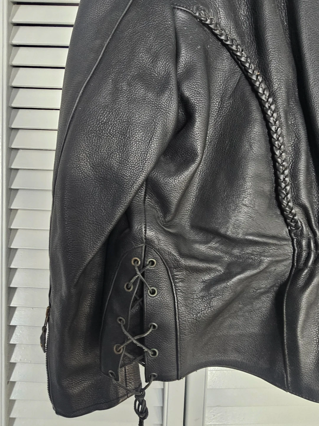 Black leather motorcycle jacket with braided accents and lace-up sides. Size is 2XL. Made in Pakistan, designed in the U.S.A. A classic look for riders!