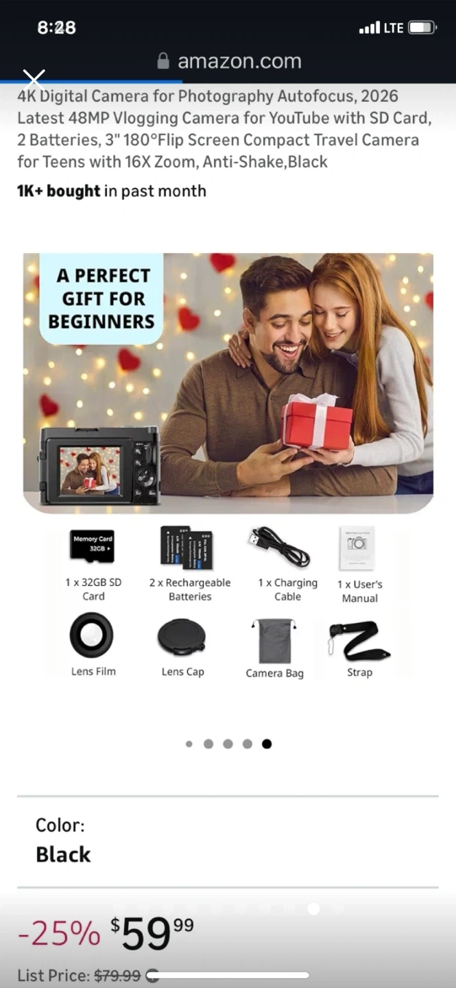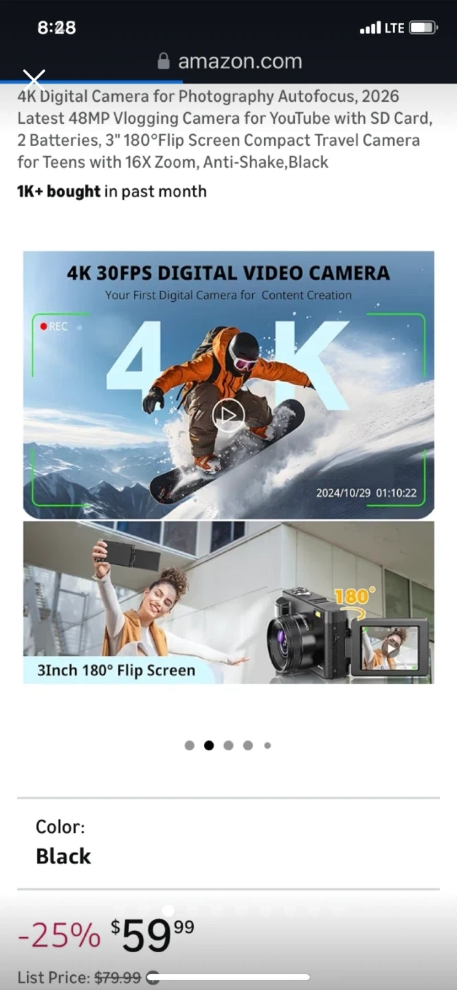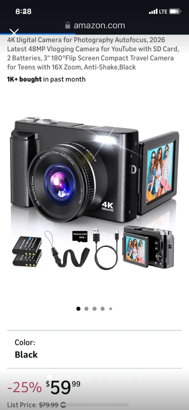 This 4K digital camera has a 48MP sensor and 16x digital zoom. It features a 3-inch 180-degree flip screen and anti-shake capabilities. Includes 2 batteries and SD card support.