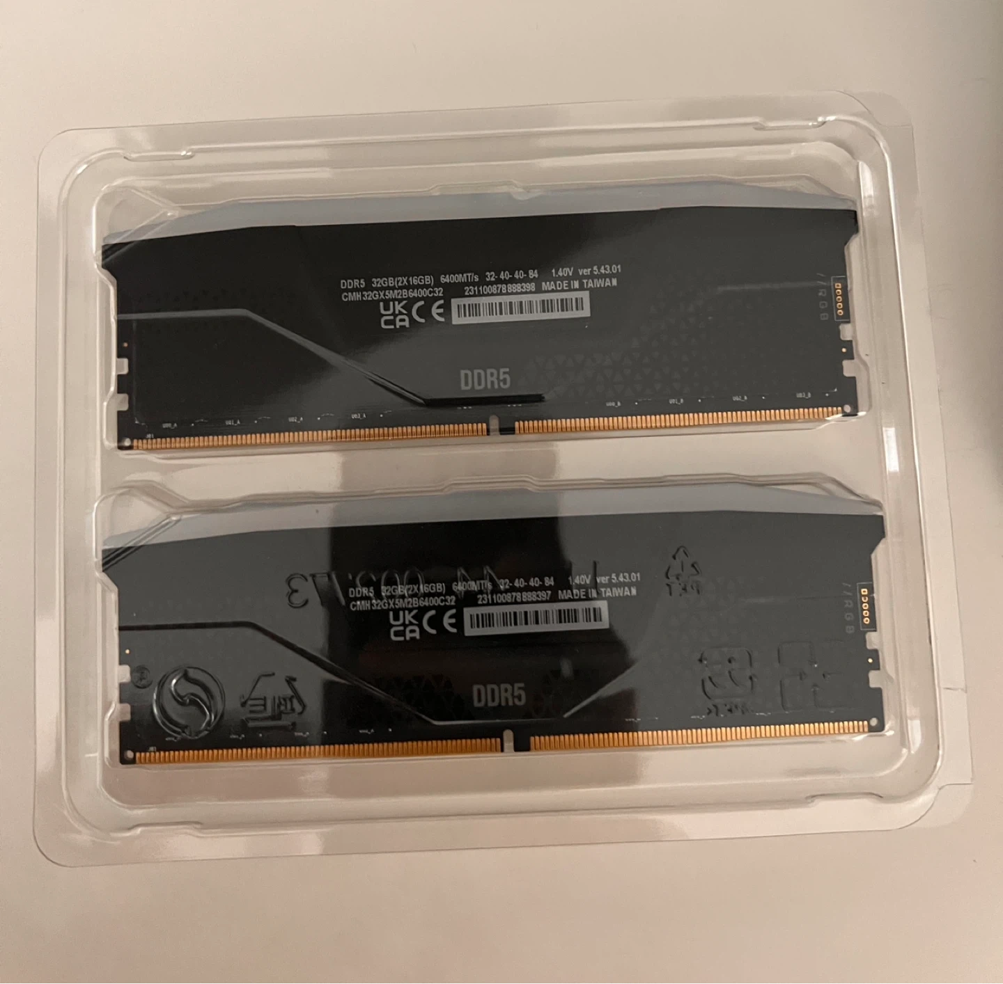 Corsair Vengeance RGB DDR5 performance DRAM. This kit includes 2x16GB modules running at 6400MHz with XMP support. They’re brand new as they were a RMA replacement for a previously faulty kit. Not used aside for testing purposes to ensure they worked optimally.