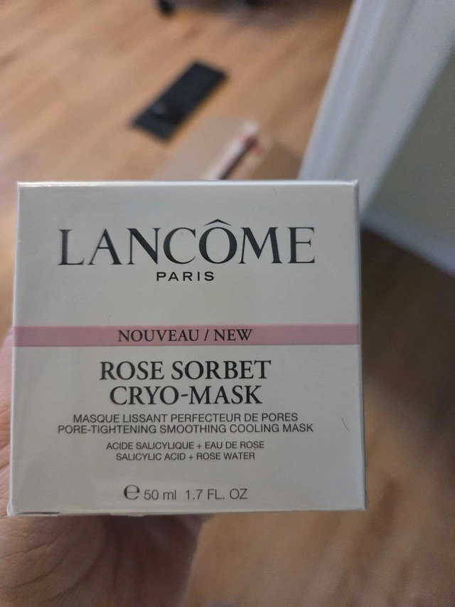 Experience the luxury of the Lancome Rose Sorbet Cryo-Mask, a pore-tightening smoothing cooling mask with salicylic acid and rose water, in a 50ml (1.7 FL. OZ) size. This mask is new and ready to deliver a refreshing touch to your skincare routine.