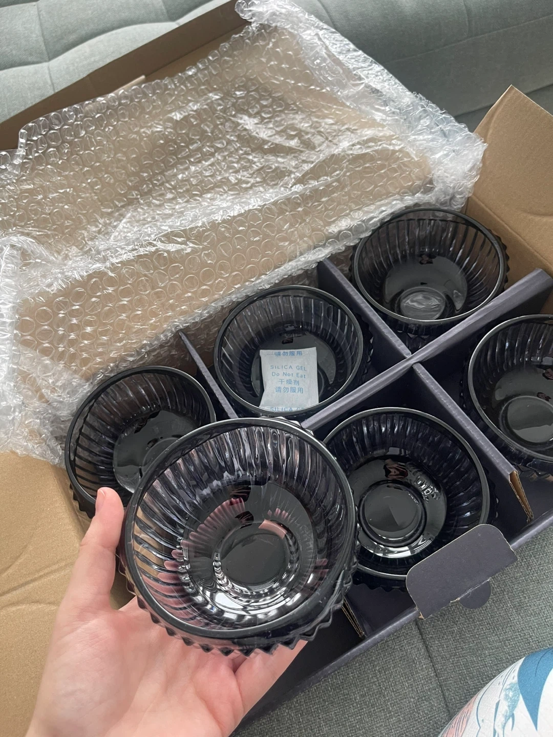 This is a set of six black glass bowls. They feature a ribbed design and come in their original packaging. These bowls are suitable for serving snacks or desserts.