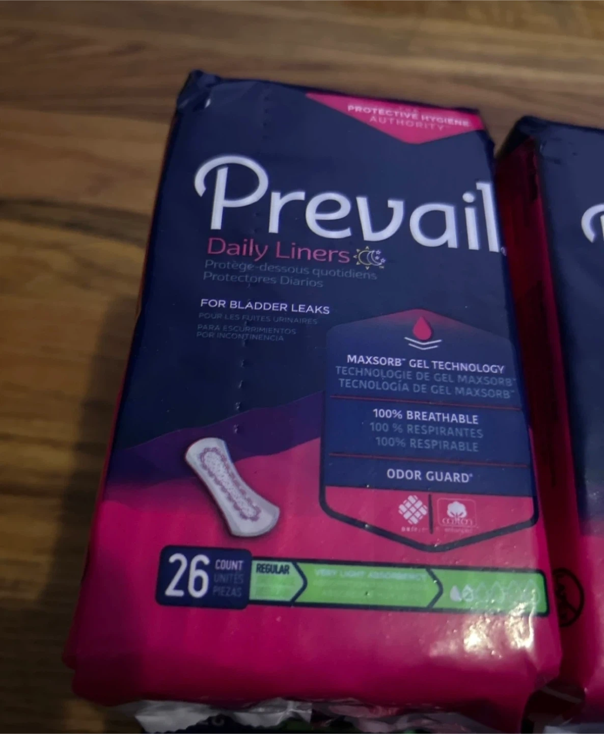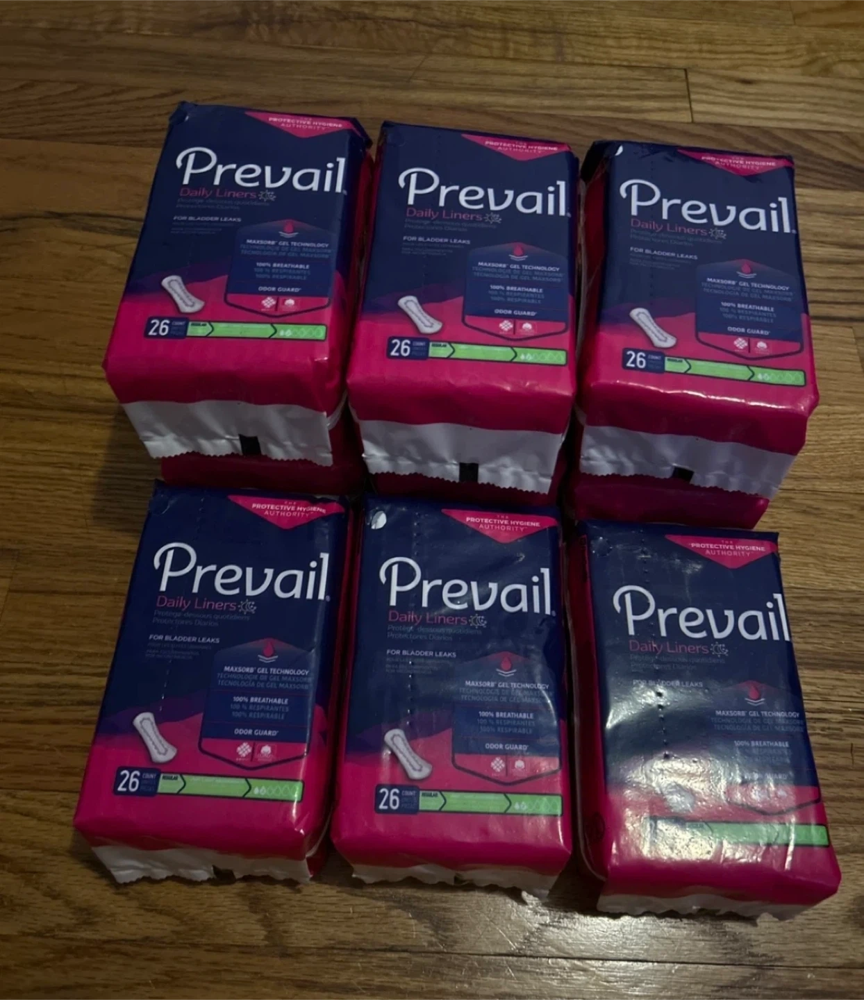 6 packs of Prevail Daily Liners. These liners are designed for bladder leaks and offer MAXSORB gel technology for quick absorption. They're also 100% breathable and feature odor guard for extra confidence. Each pack contains 26 Liners.