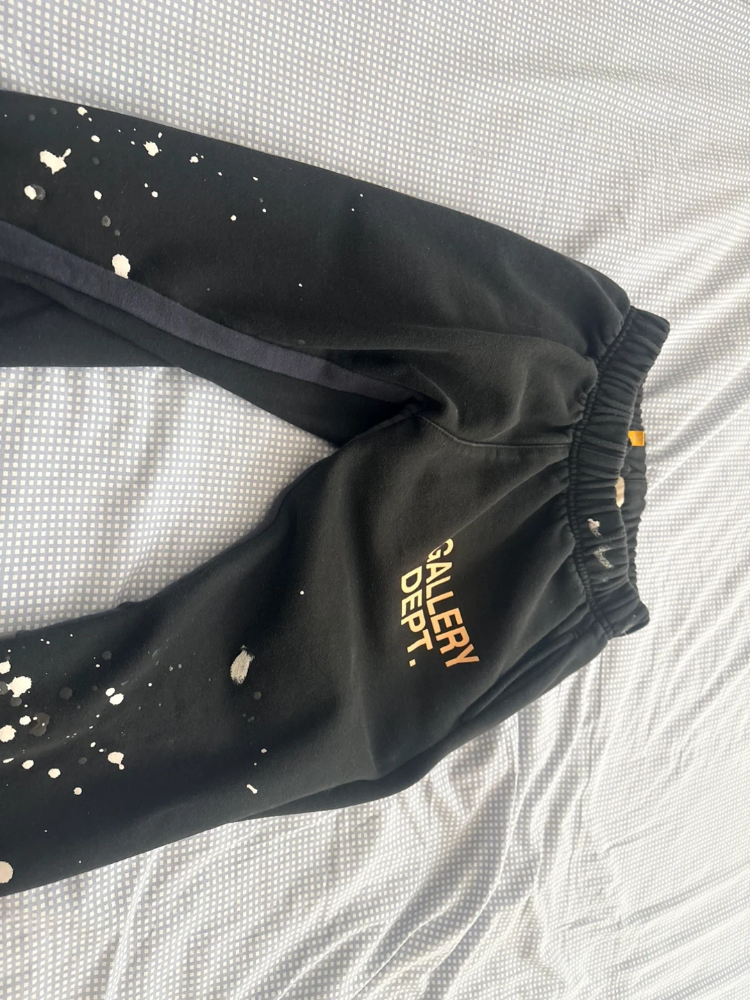 Gallery Dept. sweatpants in black. Made in the USA from 100% cotton. These sweatpants have a paint splatter design. Care instructions: wash cold, low heat.