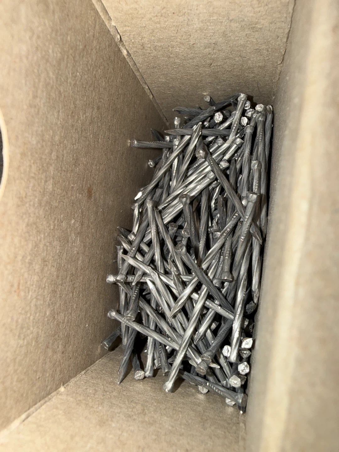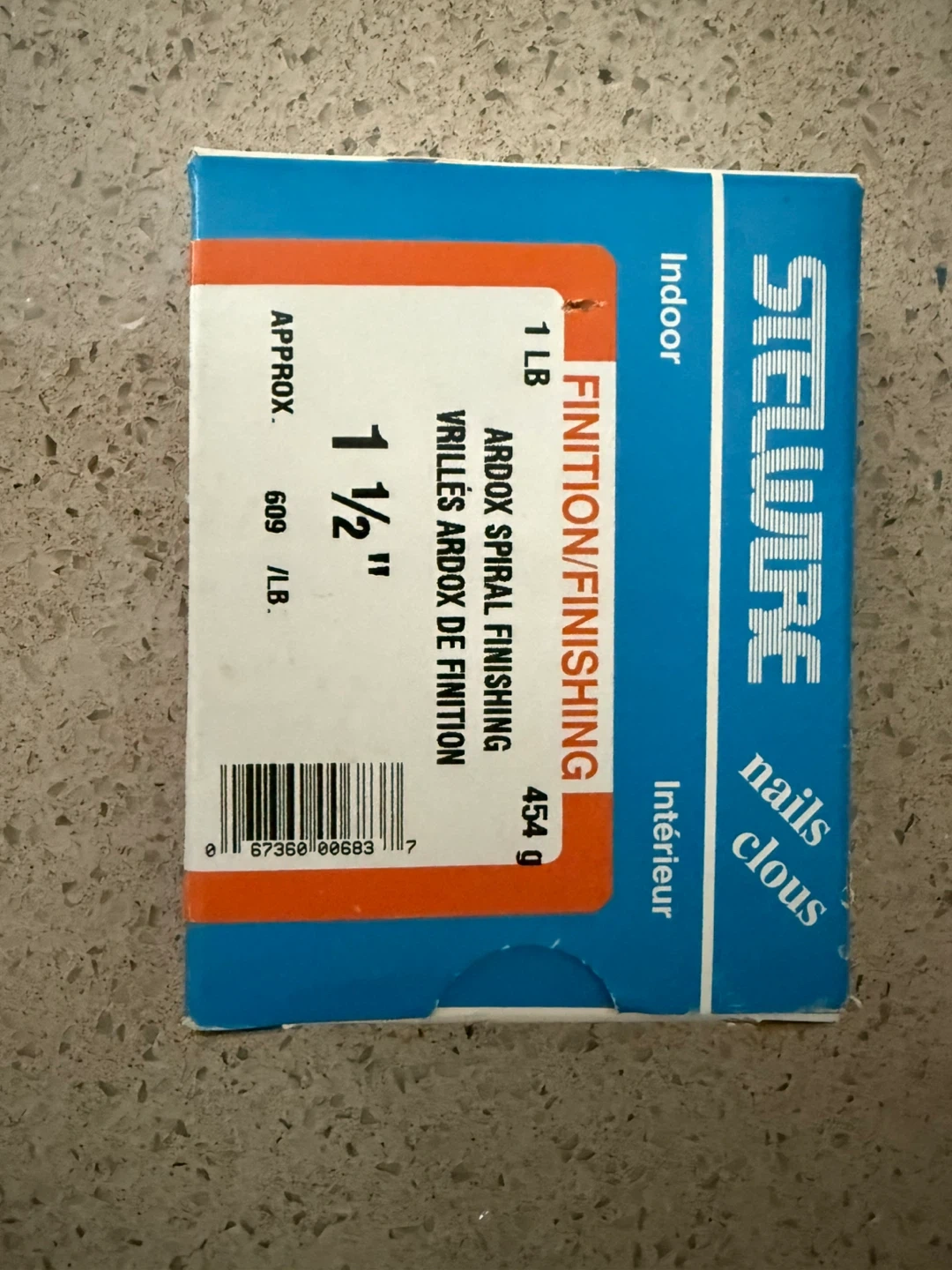 Selling a box of Stelwire Ardox Spiral Finishing Nails. These are 1 1/2" in size and are ideal for indoor finishing projects. The box contains 1 lb (454g) of nails.