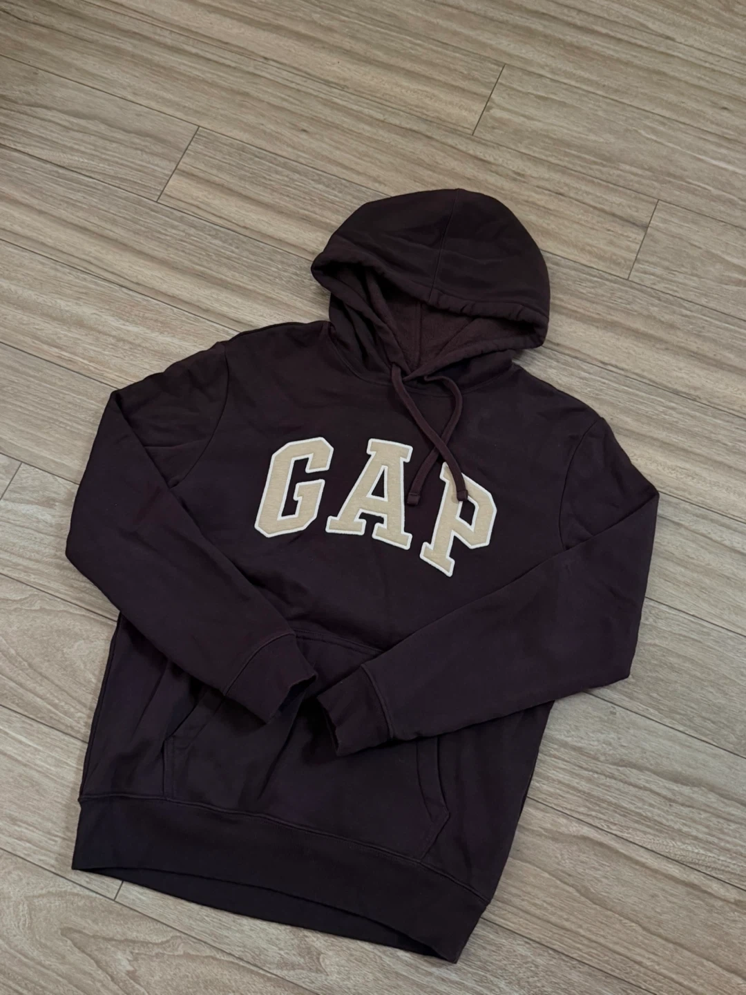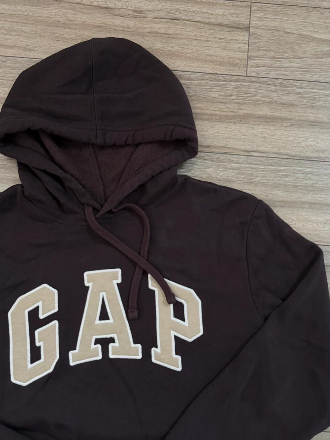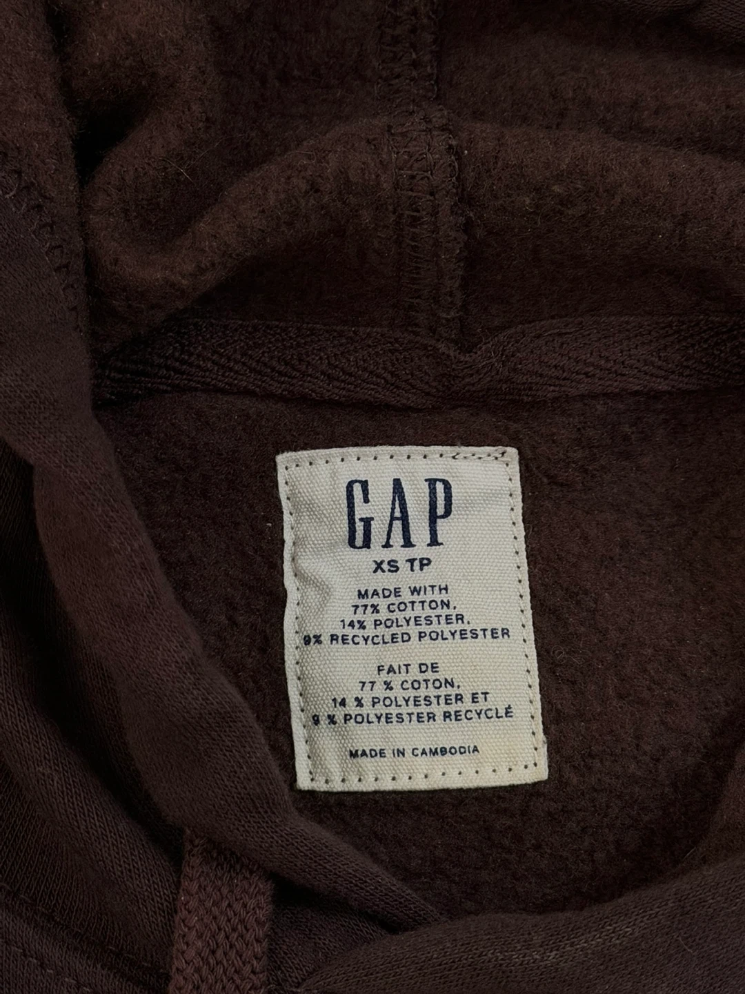 This is a brown GAP hoodie in size XS. Made with 77% cotton, 14% polyester, and 9% recycled polyester. It's a comfy staple for everyday wear!