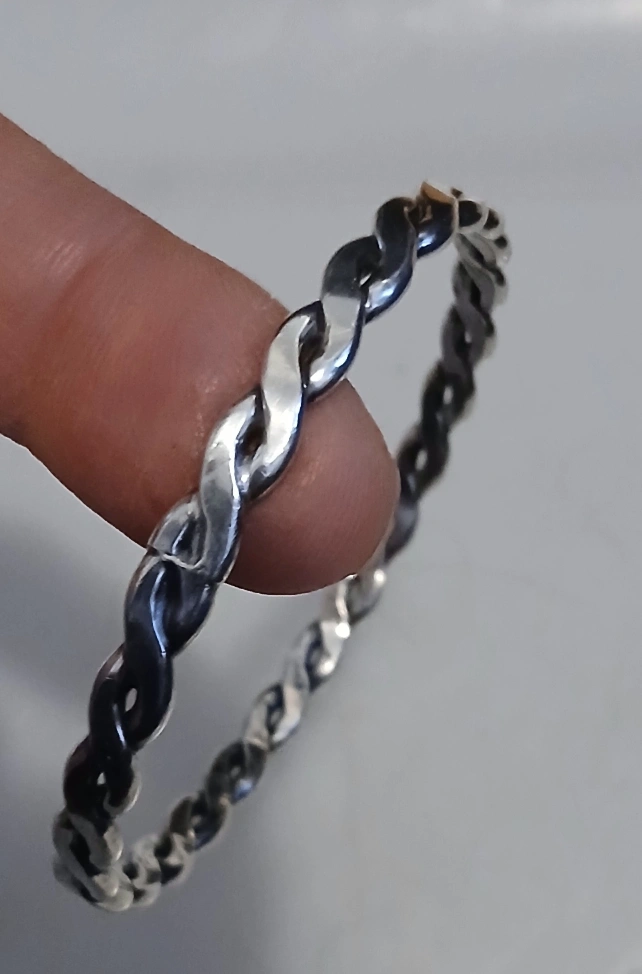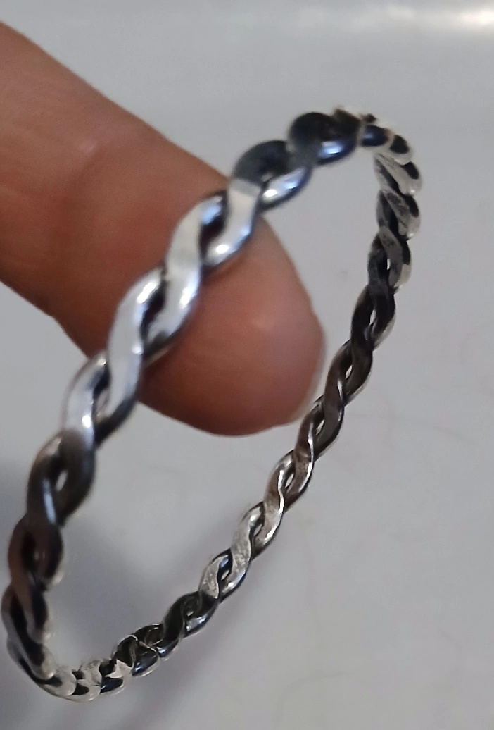 A delicate silver bengal with a twisted rope design. It's suitable for stacking or wearing on its own. Simple and elegant metalwork.