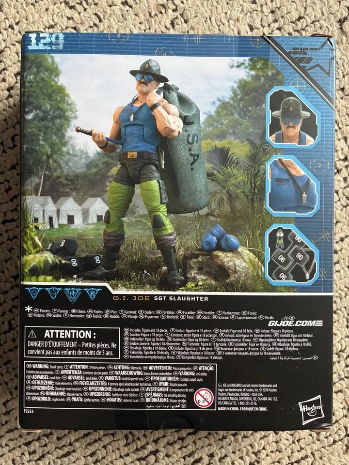 This is a G.I. Joe Classified Series Mad Marauders Sgt. Slaughter action figure, number #129. It's a 6-inch scale figure in his Mad Marauders design. Includes accessories like a campaign hat, sunglasses, boxing gloves, and a baton. Released in 2024.