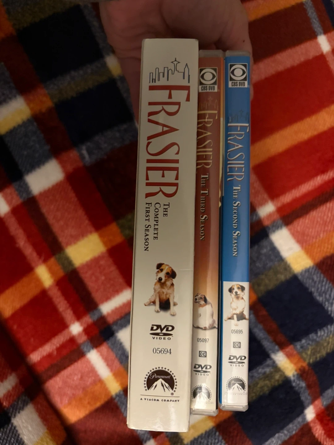 This DVD set includes The Complete First Season, The Second Season, and The Third Season of the TV show Frasier. Each season is on its own DVD case. It's great for fans of the show who want to relive all the witty moments.