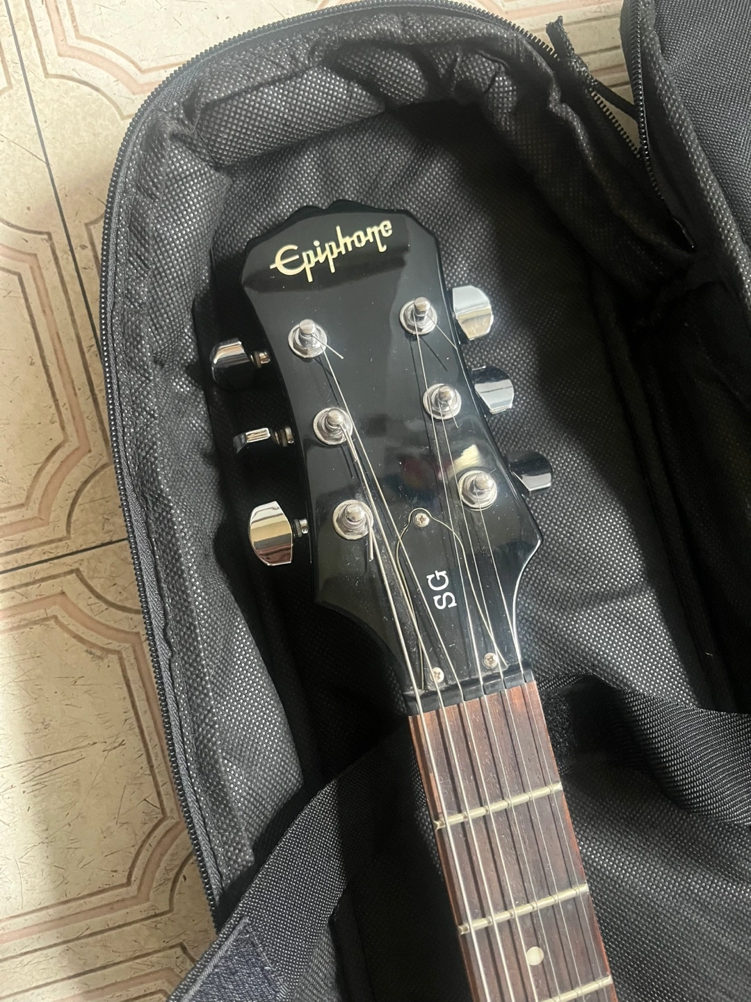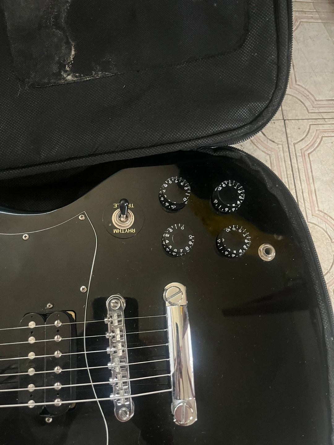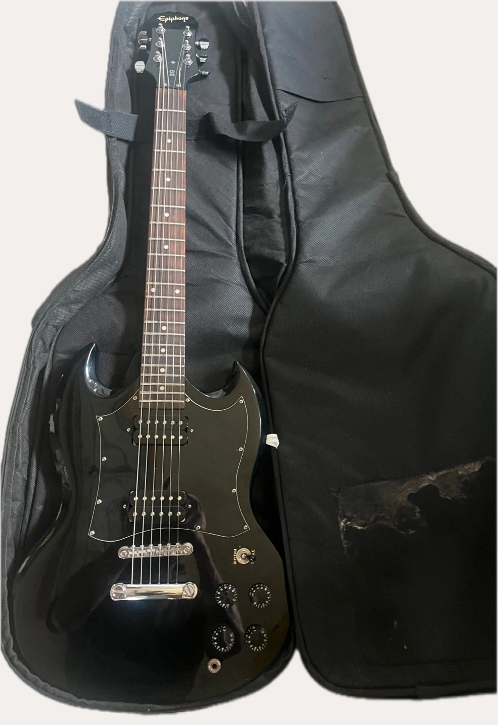 Selling a black electric guitar. It's in a gig bag for protection. Great for someone looking to start playing or upgrade their current instrument