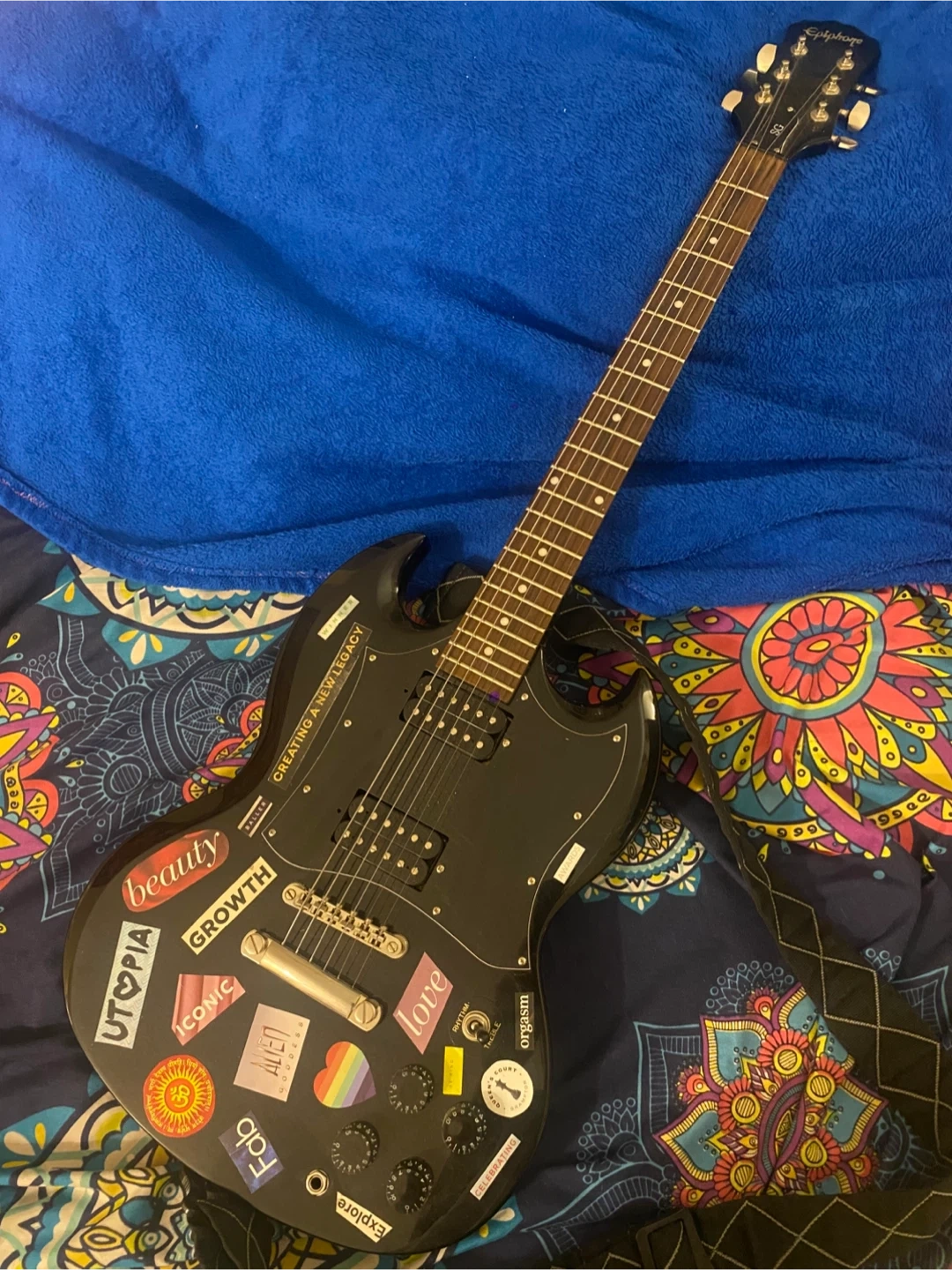 10Selling an Epiphone SG electric guitar. It's black and has some stickers on it. Can easily come off. But they look dope and have positive affirmations on them. Great for someone looking to learn or upgrade! Magical guitar π Video of guitar: https://youtu.be/Li7rybpJaQo?si=1tpxsbgu3_PQsjxS