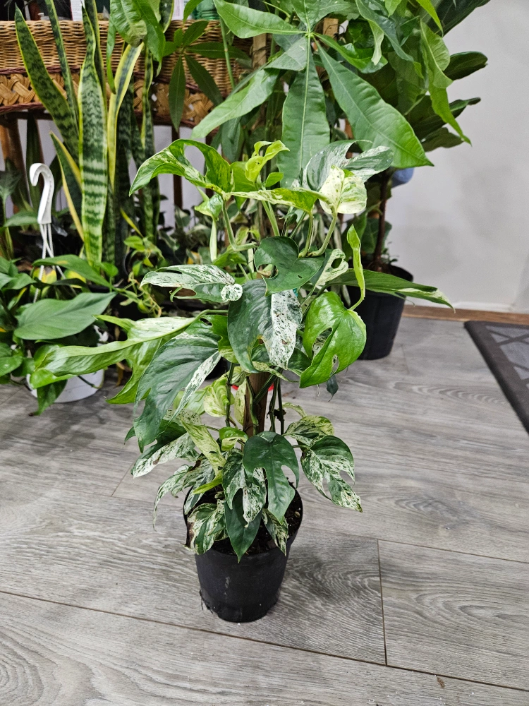 Selling a beautiful variegated epipremnum pinnatum plant! It's a healthy plant with lovely variegation, ready to brighten up your home or office. It comes in a black plastic pot and is supported by a wooden stake.