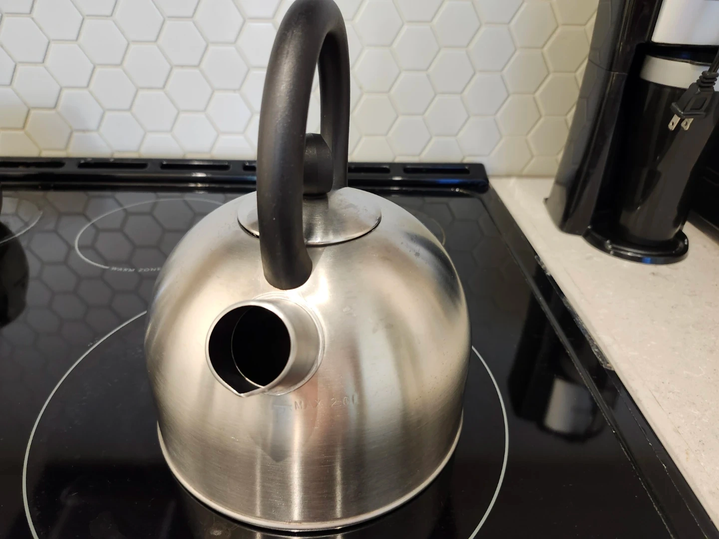 This is a stainless steel stovetop kettle with a black handle. It has a maximum fill line marked inside. It's ready for your next cup of tea or coffee!