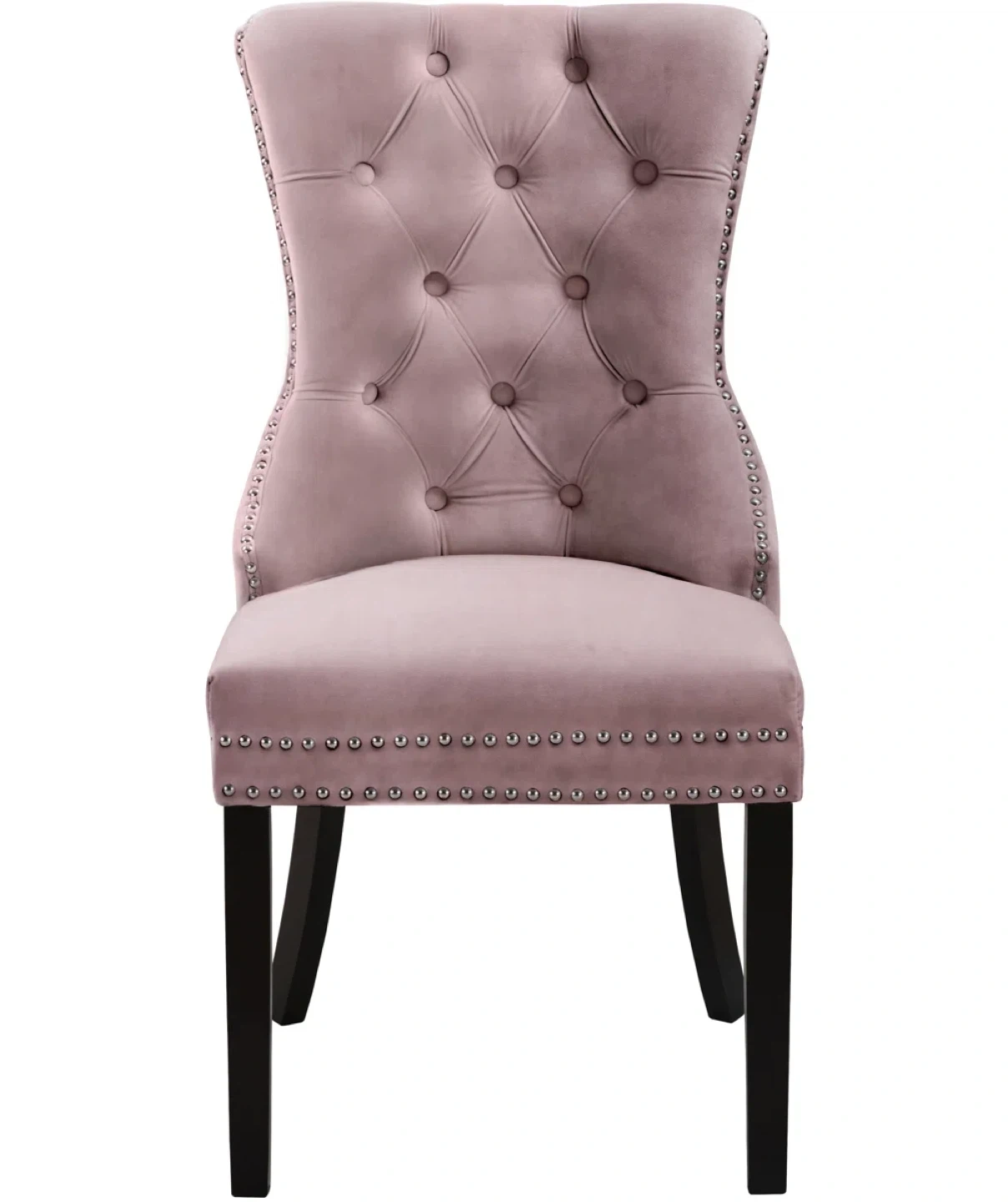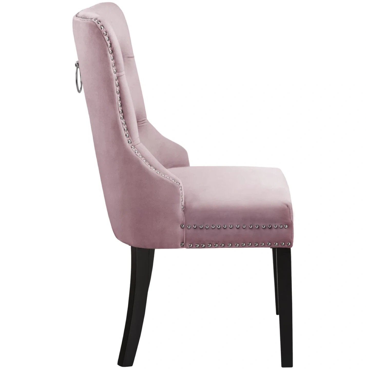 This is a beautiful pink velvet dining chair. It features a tufted back and nailhead trim, adding a touch of elegance to any dining space. The chair has dark wooden legs and a ring detail on the back. It's in great condition and ready to enhance your dining room or kitchen!