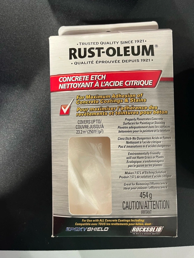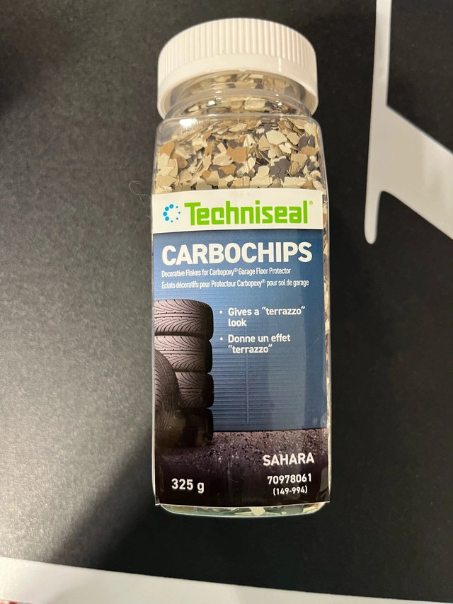 5Various garage epoxy materials: - Protector for epoxy - 2 containers - 3.78 L Price $ 150 each - Carbochips Decorative Flakes - 2 containers- 325 g - Sahara Price $ 10 each - Rust-Oleum Epoxyshield Citric-Based Concrete Etch - Environmentally Friendly - 450-g Price $ 17 each For Sale By: Owner