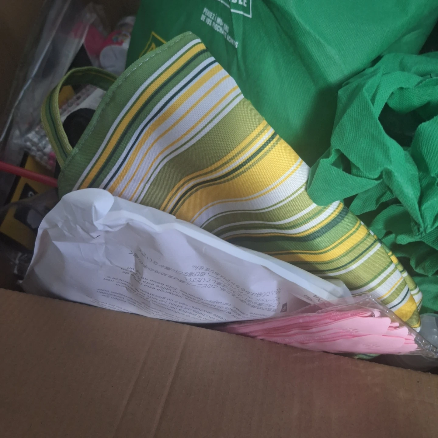 Assorted items found in a medium-sized box, including reusable shopping bags, party supplies, and household goods. Box dimensions are 18 in. x 18 in. x 16 in. (45.7 cm x 45.7 cm x 40.6 cm). Contents vary.