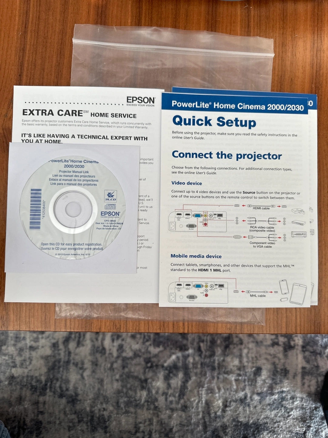 103Projector with 3LCD technology. Includes remote and power cable. Full HD 1080p 2D and 3D 1080p Performance at a Remarkable Value Discover bright cinematic adventures at home with the Home Cinema 2030. Enjoy Full HD 1080p performance practically anywhere, in 2D or 3D. Images are always rich and brilliant with 2000 lumens of colour brightness1 and 2000 lumens of white brightness1. Cheer on your favorite team with images up to 300" on any wall or screen. Use the built-in sound or your own speakers. Setup is easy. The Home Cinema 2030 comes with two HDMI ports. And, MHL connectivity turns your projector into a smart display, providing instant access to movies, videos and games from MHL-enabled smartphones and tablets2 . Up to 3x Brighter Colours with Epson* Brilliant image quality requires high colour brightness. Epson 3LCD projectors have up to 3x Brighter Colours than leading competitive projectors.* Delivering 2000 lumens of colour brightness1 and 2000 lumens of white brightness1, the PowerLite Home Cinema 2030 uses 3LCD, 3-chip technology for brilliant images with true-to-life colour. Projection System: 3LCD, 3-chip technology Native Resolution: 1080p (1920 x 1080) Colour Brightness: 2000 lumens1 White Brightness: 2000 lumens1 https://epson.ca/Certified-ReNew/Home-Entertainment/PowerLite-Home-Cinema-2030-2D-3D-1080p-3LCD-Projector/p/V11H561020-F?srsltid=AfmBOorBIZ6zbYwX9ErJi_bGVz3X2Ip28n0XJWmLvsG_ZJV7WMTOoVFs