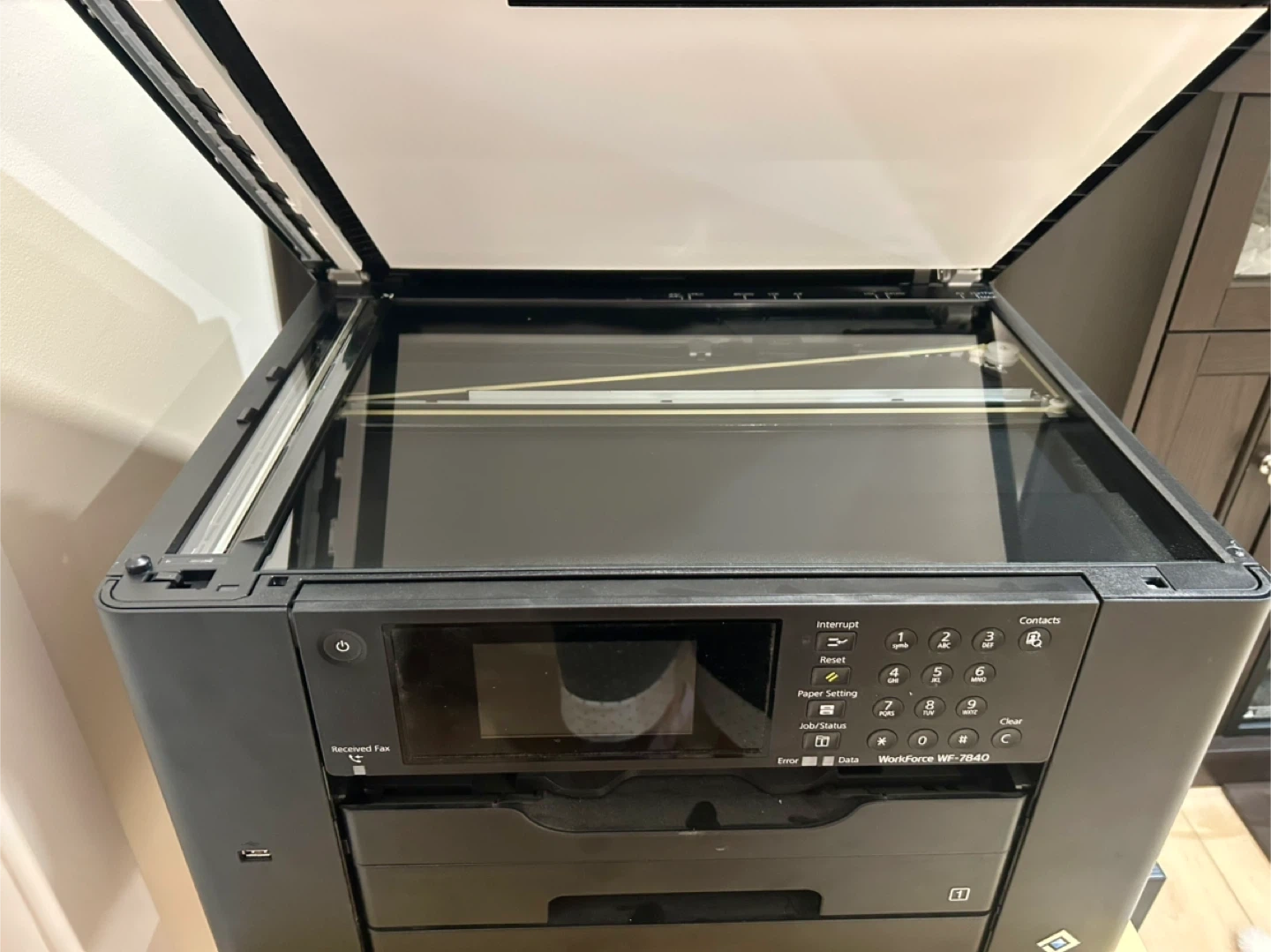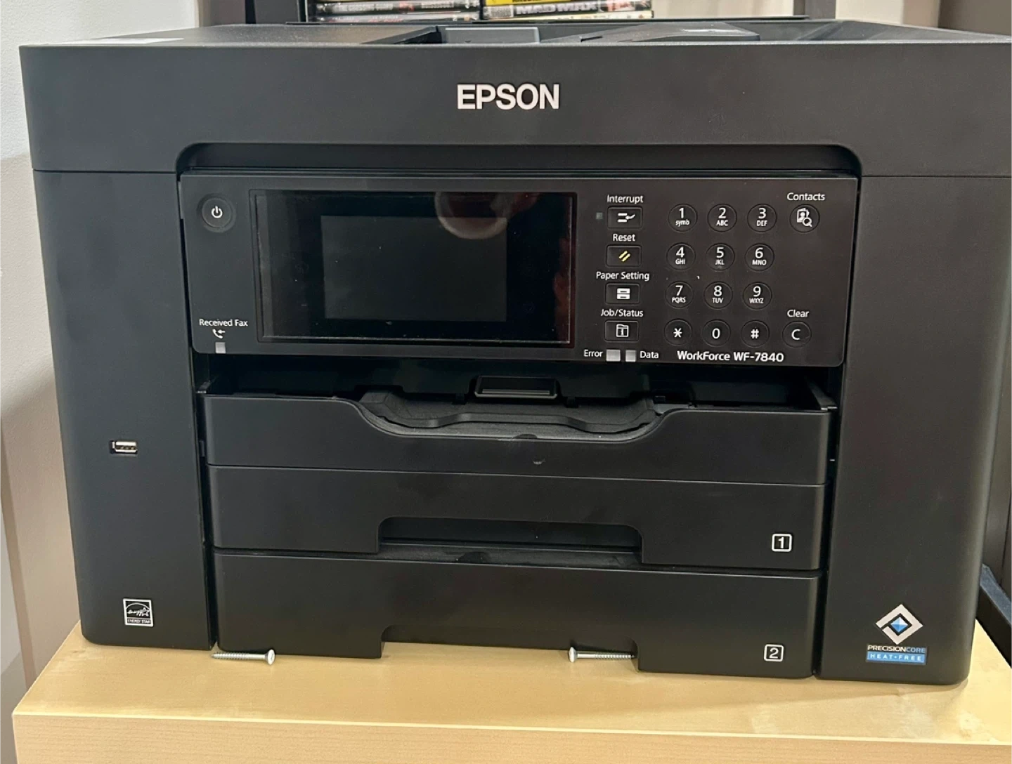 Selling an Epson WorkForce WF-7840 printer. It's in pristine condition and ready for a new home! It can handle various paper sizes, including A3/A4. It just needs new cartridges. Perfect for home or office use.