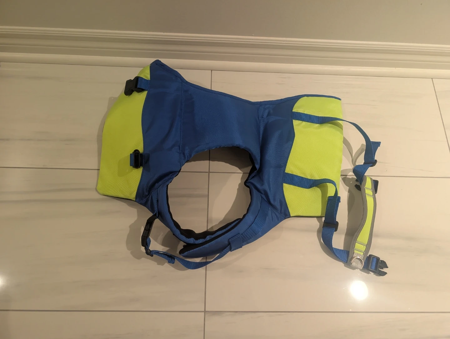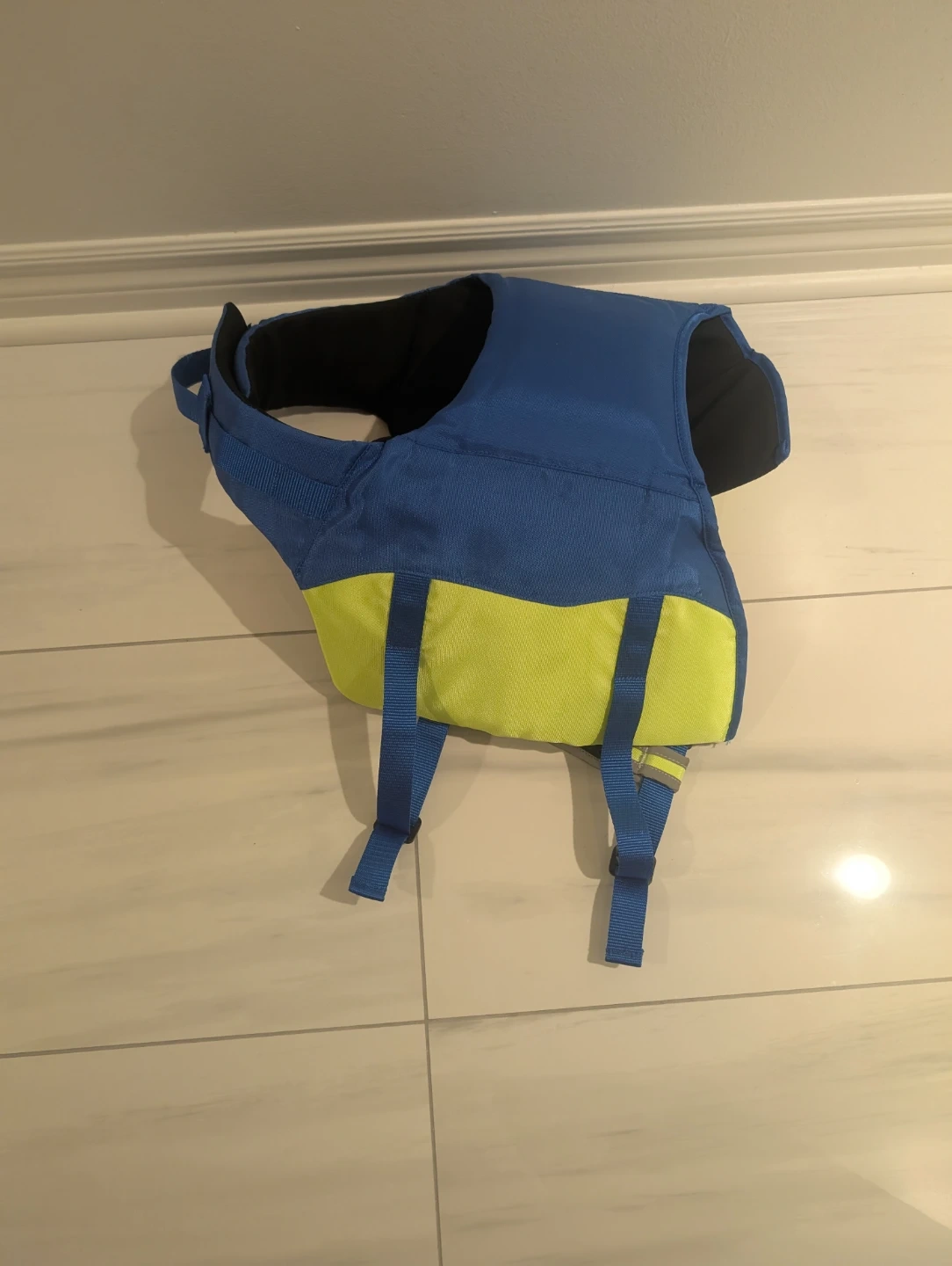 This dog life vest is designed for water safety. It features adjustable straps for a secure fit. Blue and bright yellow for visibility in Large. Cash only please.