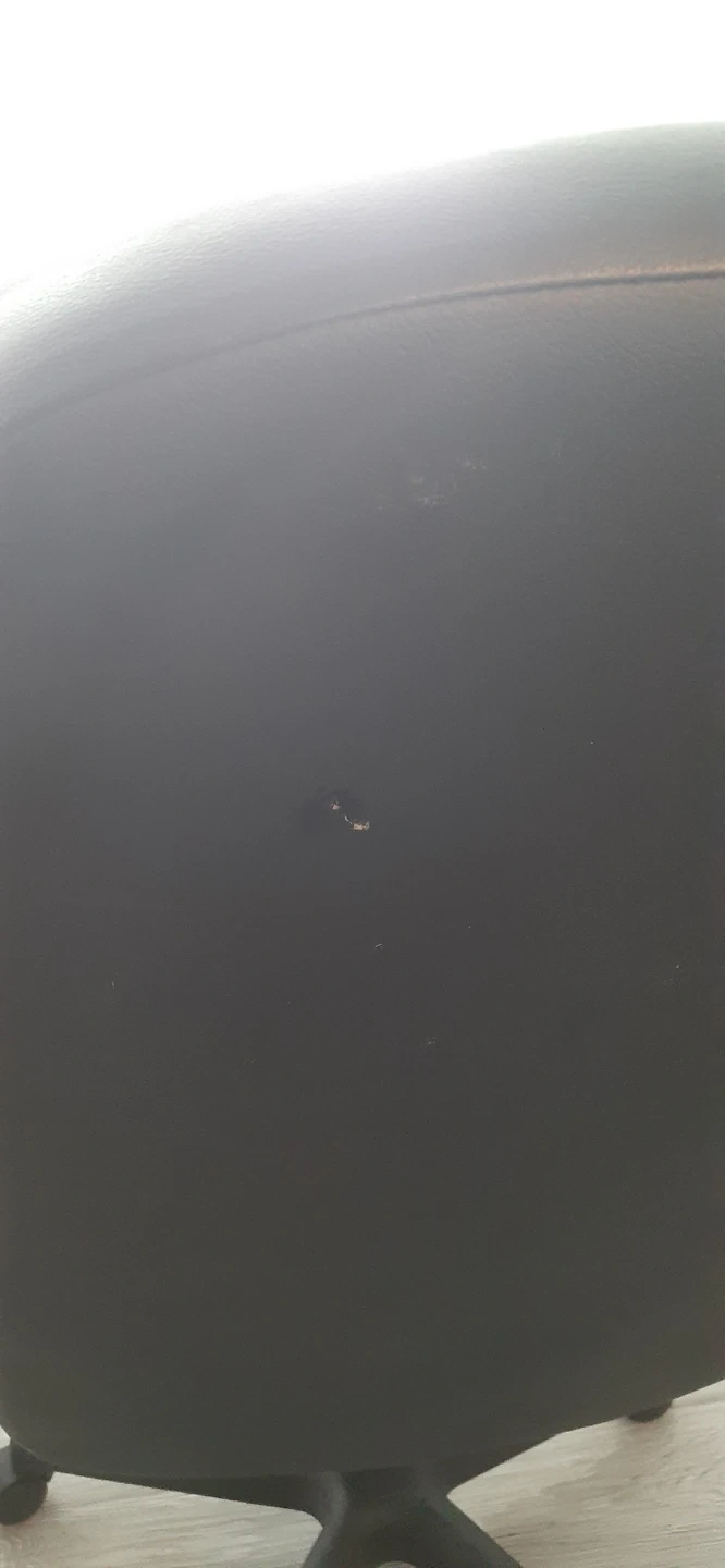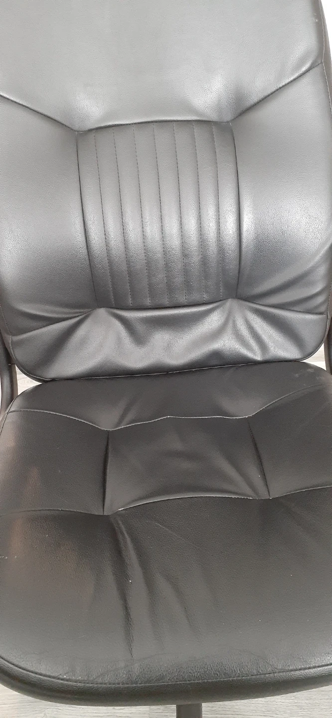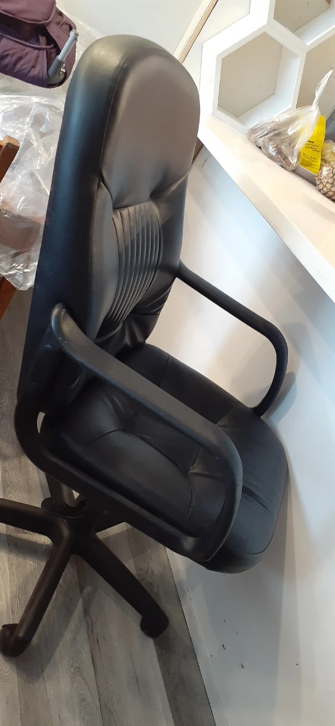 This is a black office chair. It's made of faux leather and has a sturdy base with wheels. Some minor wear is visible on the back.