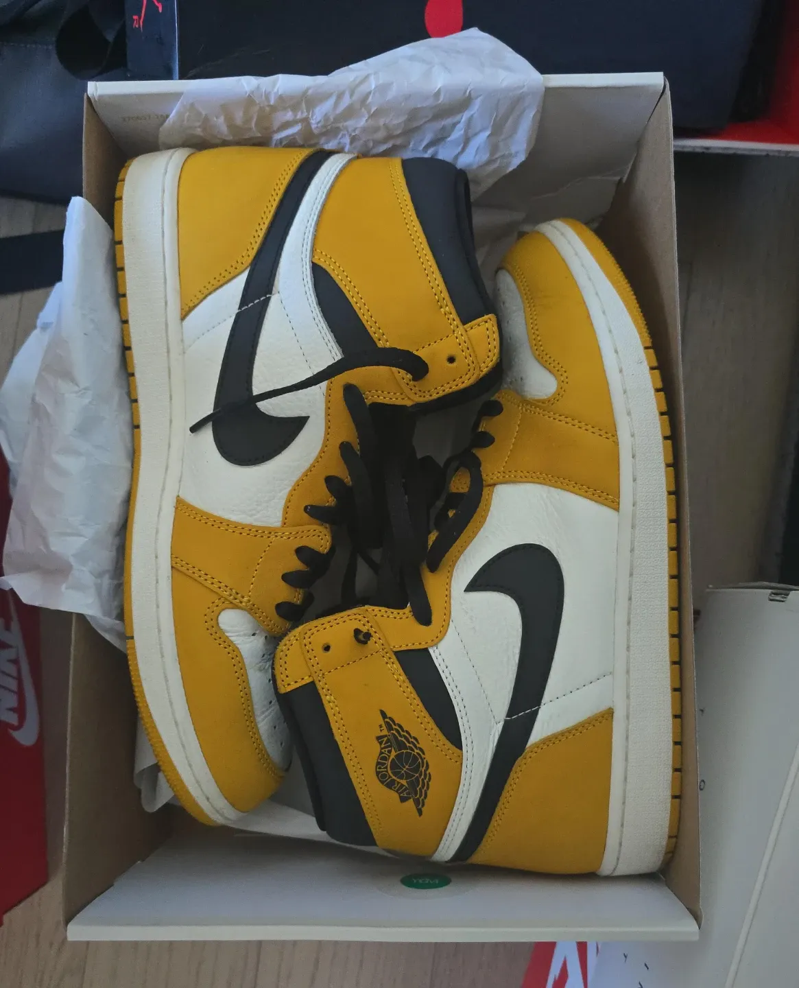 These Jordan 1 High OG sneakers come in a "Taxi" colorway. They feature a leather construction with a rubber sole. Comes with original box and packaging.