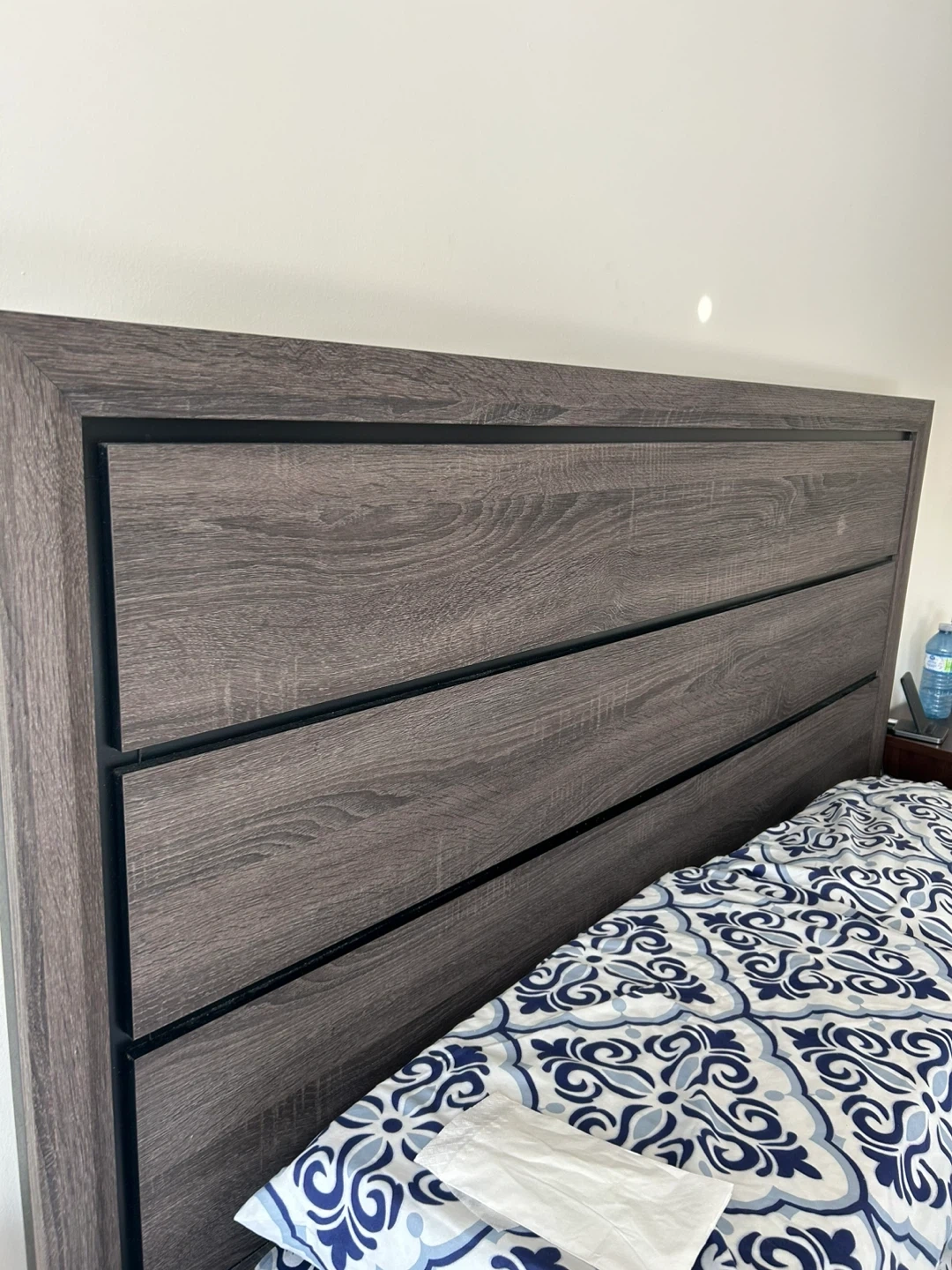Selling a queen size bed frame. It features a modern design with a wood-like finish. Perfect for adding a touch of style to your bedroom!