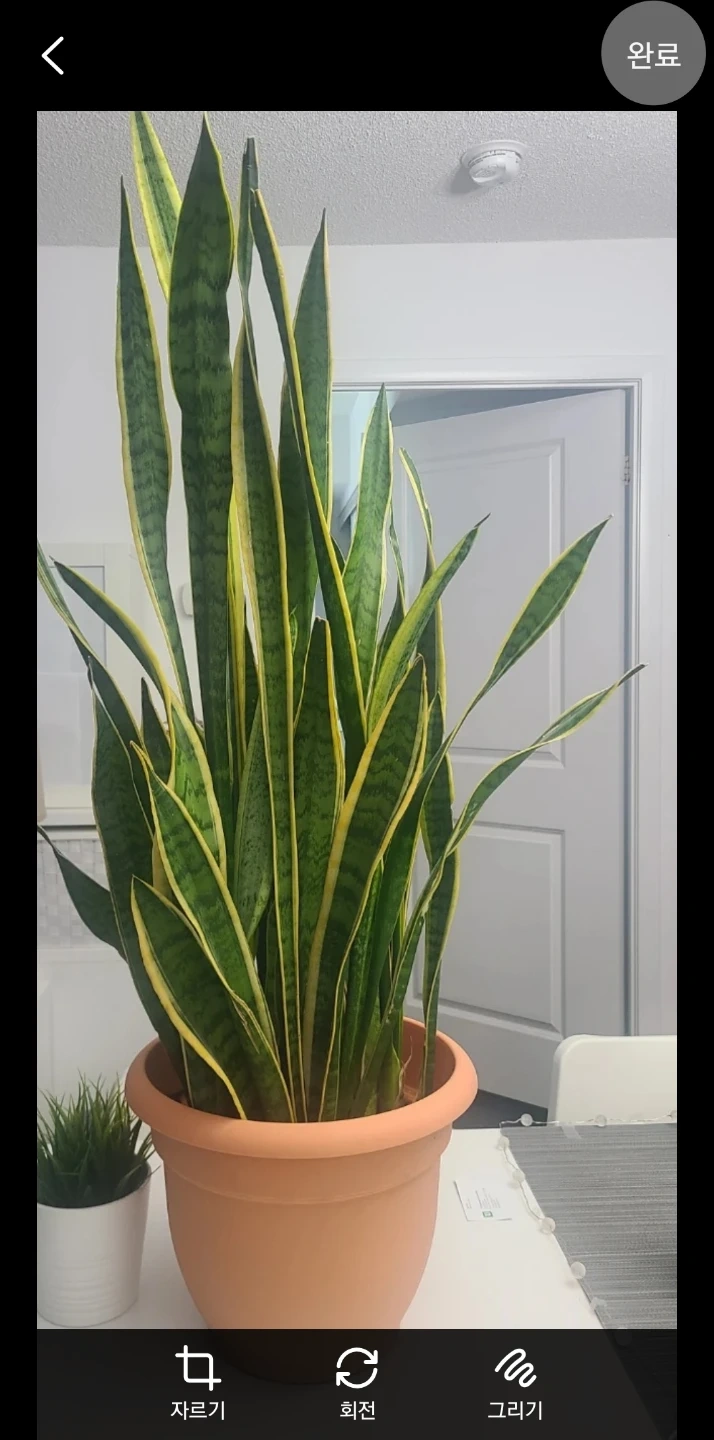 Healthy snake plant with variegated leaves. It would brighten up any room. Very easy to care for! The plant is approximately 47 inches and the pot is about 12 inches -31cm in diameter.