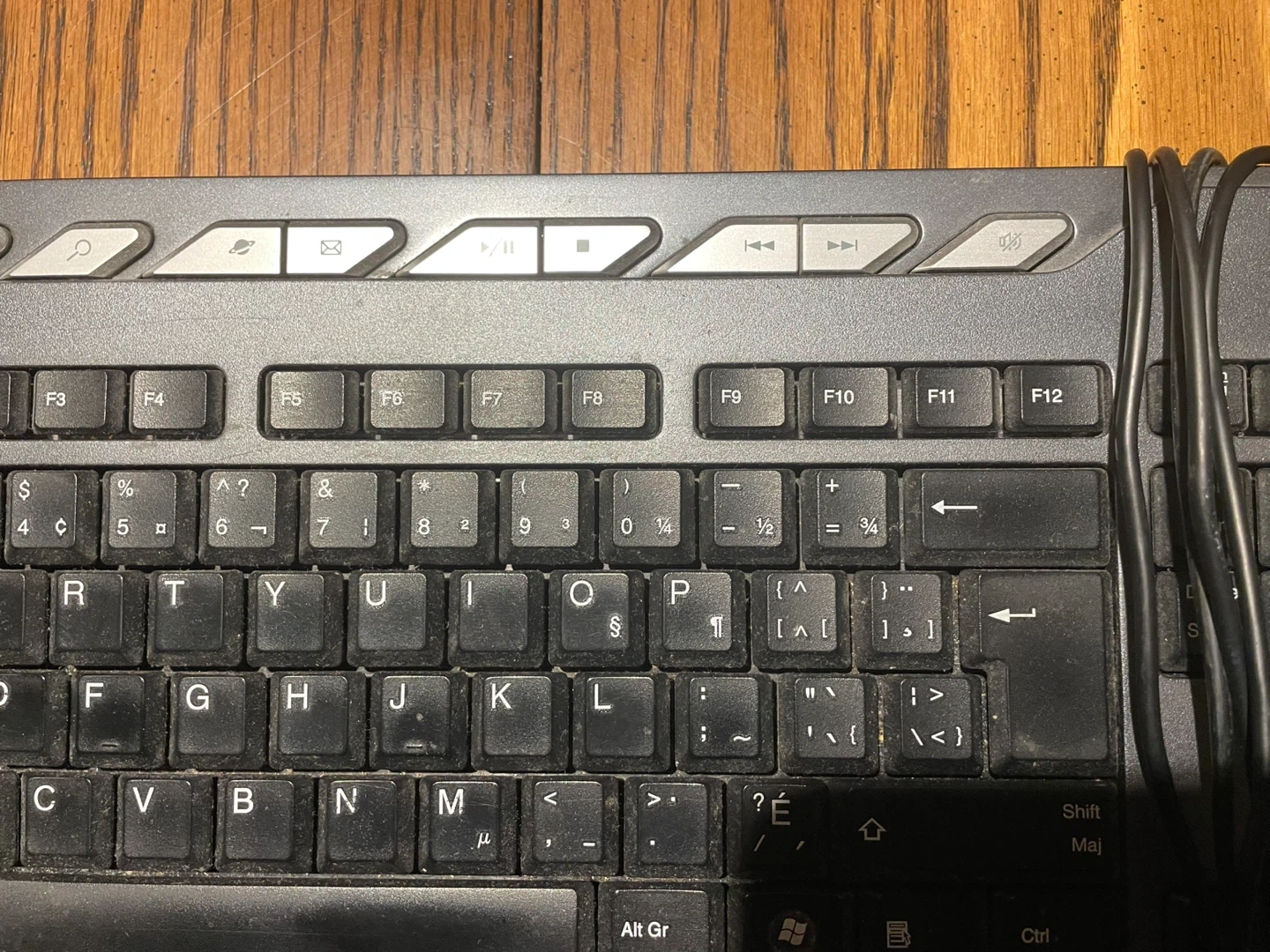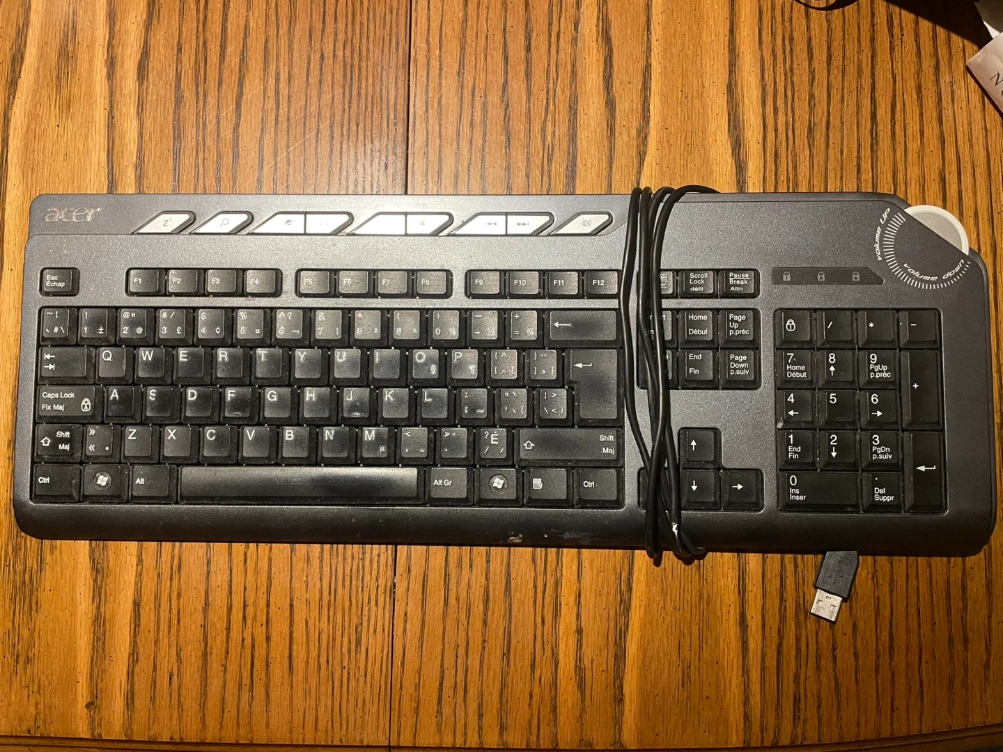 This is a grey Acer keyboard. It has standard layout with dedicated media keys. It's a wired USB keyboard.
