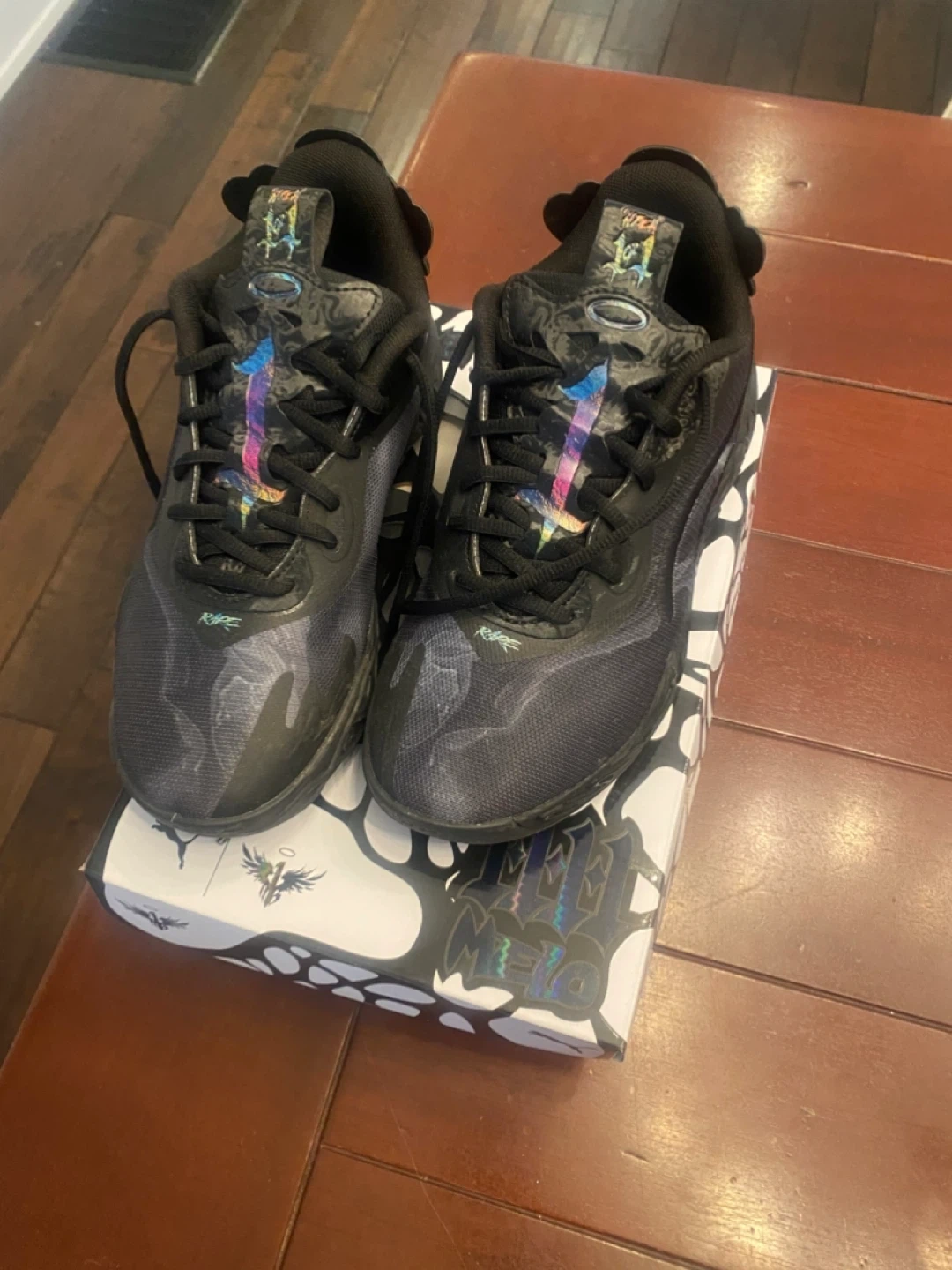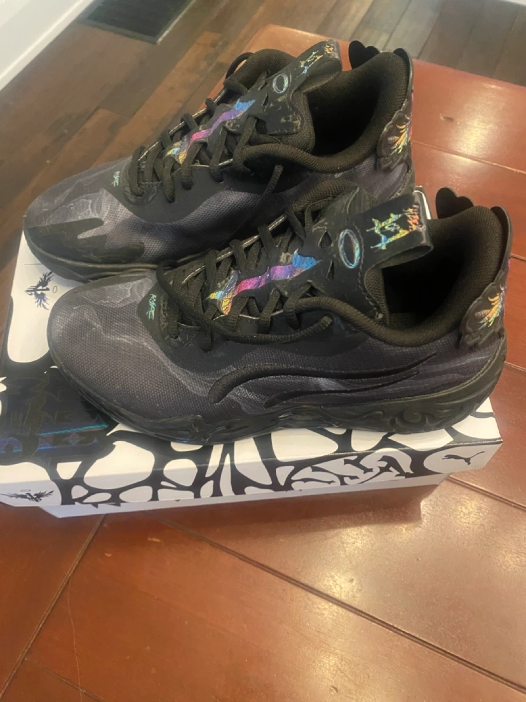 Black Puma basketball shoes with a grey and black patterned design. Features iridescent accents on the laces and heel tab. Includes original box. Size CA 5.0 (EUR 37, US 5).