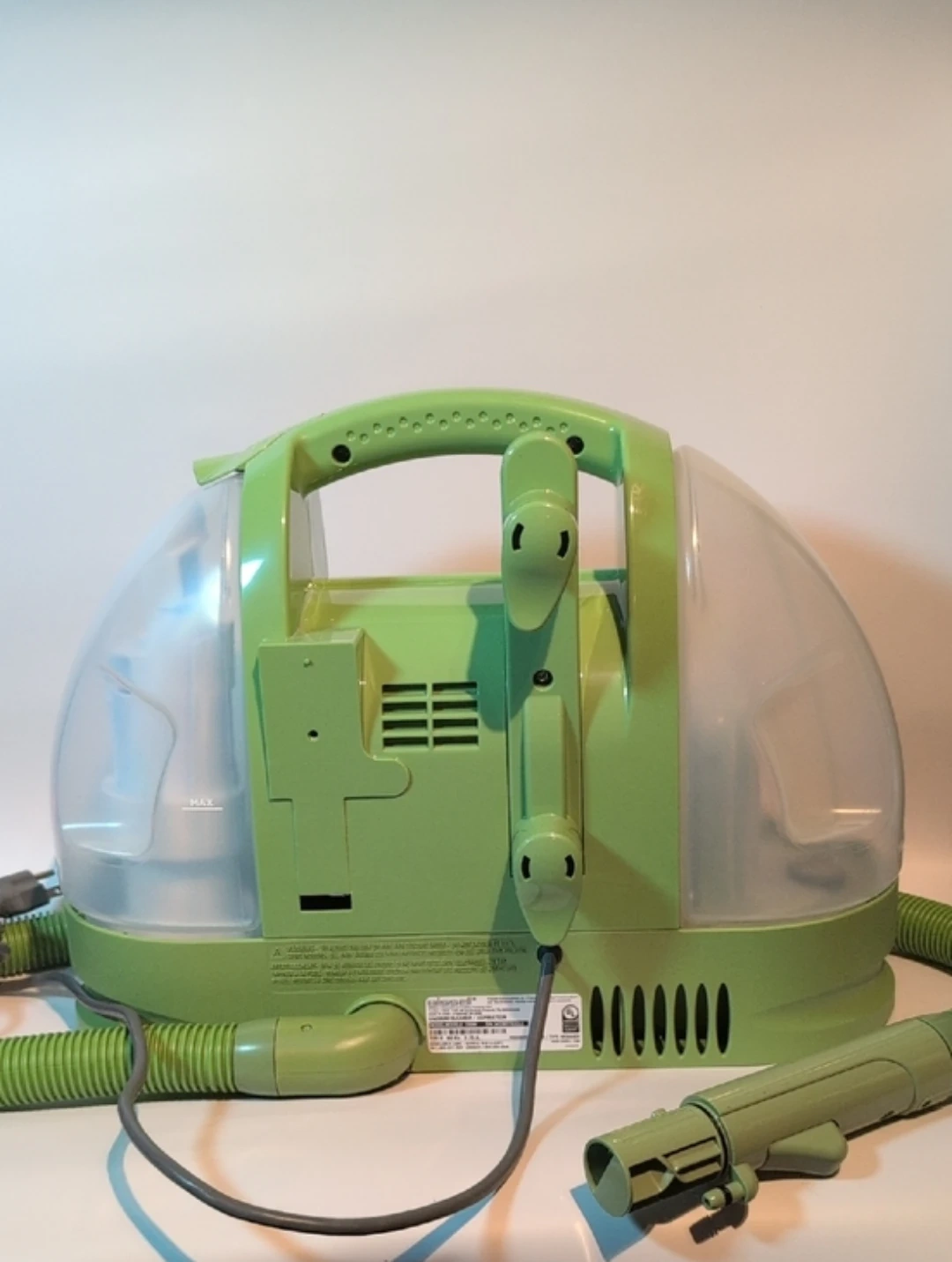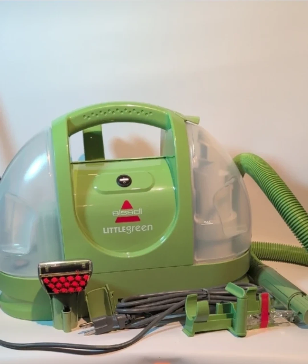 The BISSELL Little Green cleaner is a compact, corded portable carpet and upholstery cleaner designed to remove spots and stains. It features a 48 oz tank capacity, a 3-inch tough stain tool, and strong spray and suction, making it effective for carpets, stairs, and auto interiors. Brand New but does not come in original box. Tank Capacity: 48 oz (approx. 1.4 liters). Power Cord: 15-foot cord with a 2.75 Amp motor. Included Tool: 3-inch Tough Stain Tool.