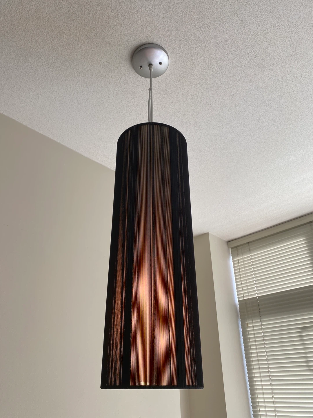 238Selling a stylish black cylinder pendant light! It's in great condition and would look lovely in any room. The shade has a nice texture and provides a warm, ambient glow A few cracks on the bottom interior per the picture but cannot see them from the outside. H 23” Diameter 8”