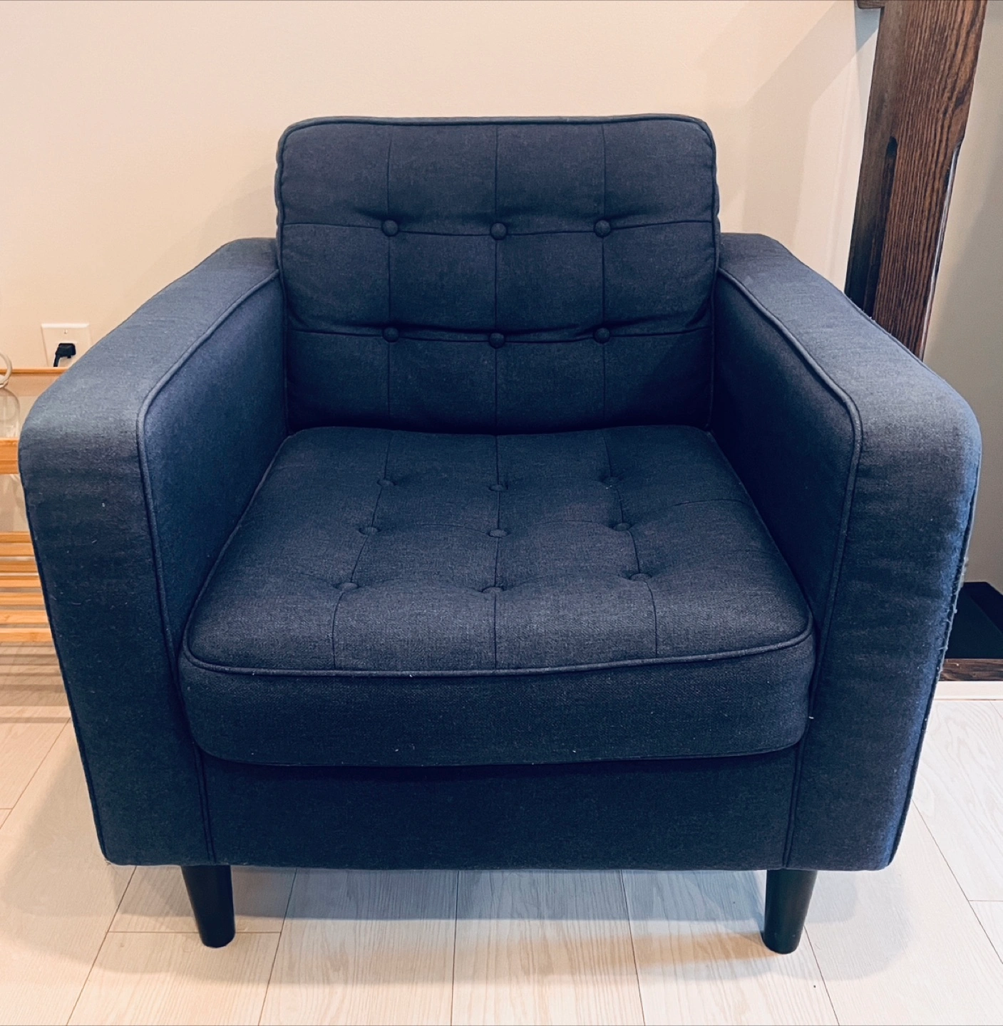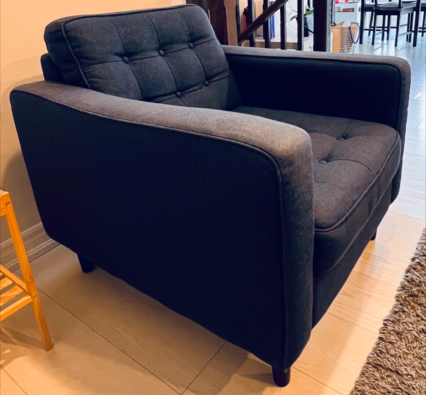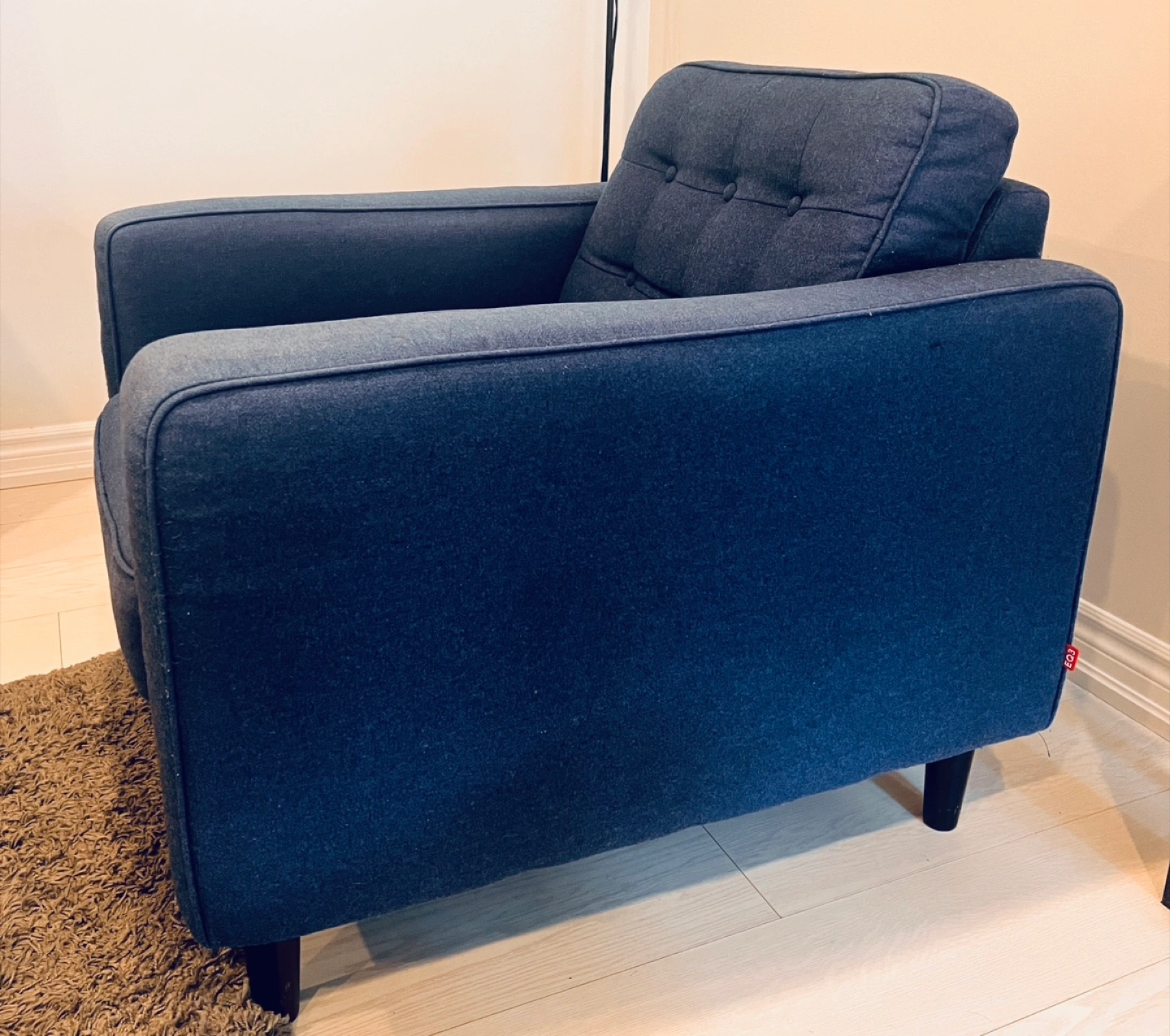 Looking to add a stylish and comfortable armchair to your space? This EQ3 armchair is in great condition and ready for a new home! The blue colour is a nice neutral that will fit in with many decor styles. It's perfect for creating a cozy reading nook or adding extra seating to your living room. Original Price : $1580(Taxes Included) Original Product details : https://urbane.ca/products/reverie-chair-fabric