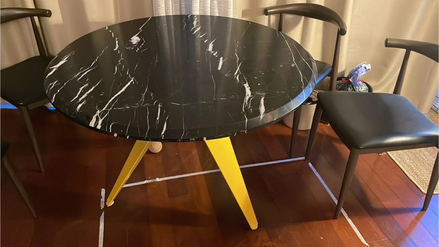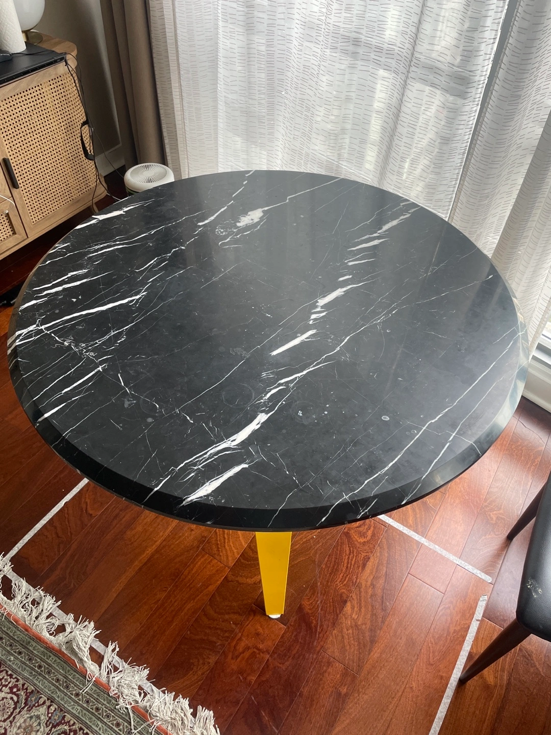 23Selling a stylish round dining table featuring a beautiful marble top and eye-catching yellow legs. It's a great addition to any dining space! The table comfortably seats four people. Original price at eq3 is $1200
