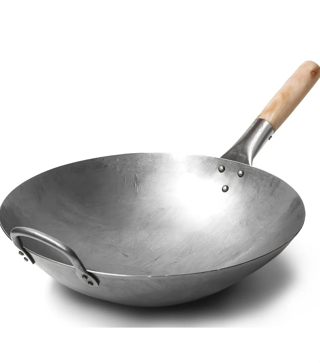 This is a hand-hammered 14-inch round bottom carbon steel wok. It's 1.8mm thick with a full length of 22 inches and a depth of 4.3 inches. Seasoning is required before first use to protect the wok and enhance its cooking performance. It's compatible with gas stoves, electric or glass cooktops, open fires, BBQs, and wok burners.