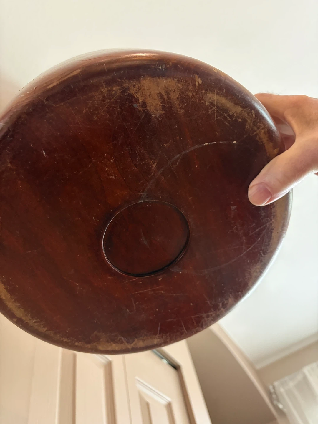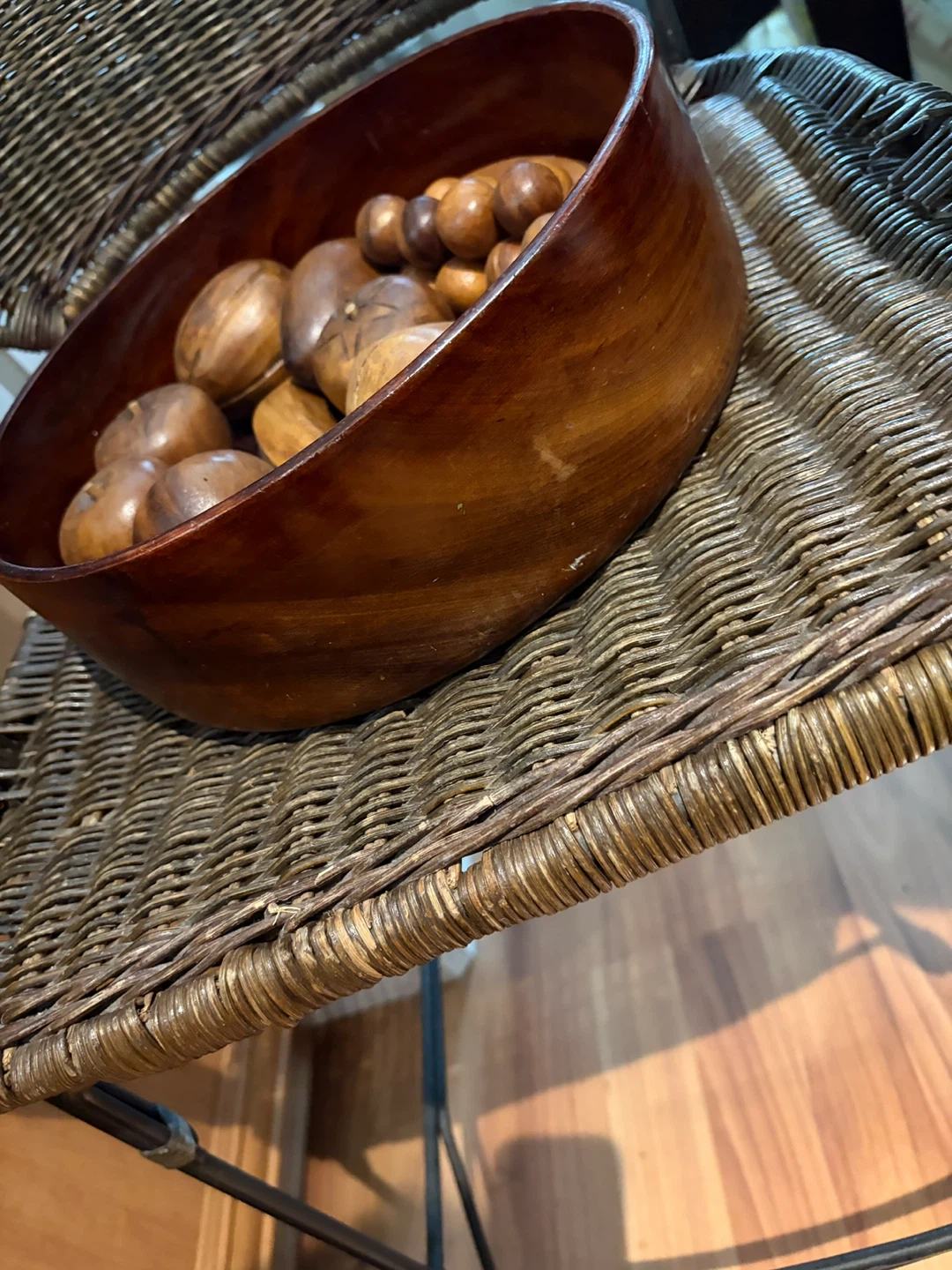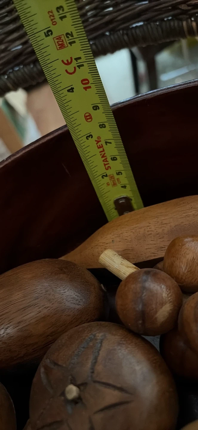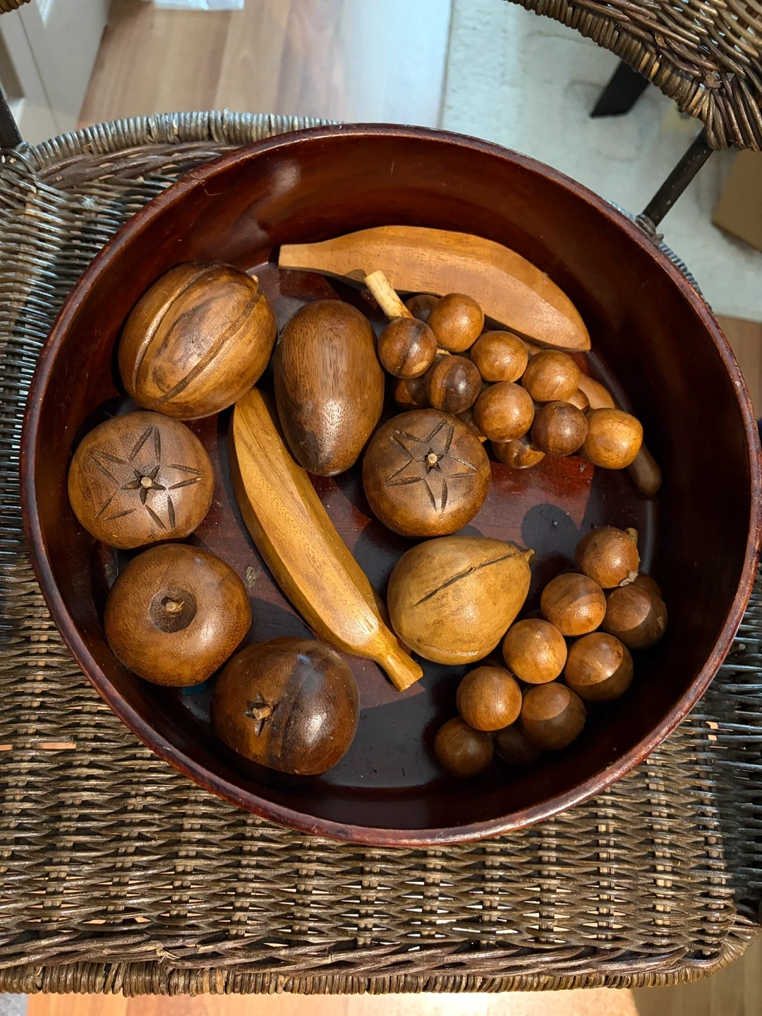 Decorative wooden bowl filled with carved fruits including bananas, grapes, and other assorted fruit shapes. The bowl measures approximately 12 inches in diameter. Adds a rustic charm to any kitchen counter or dining table!