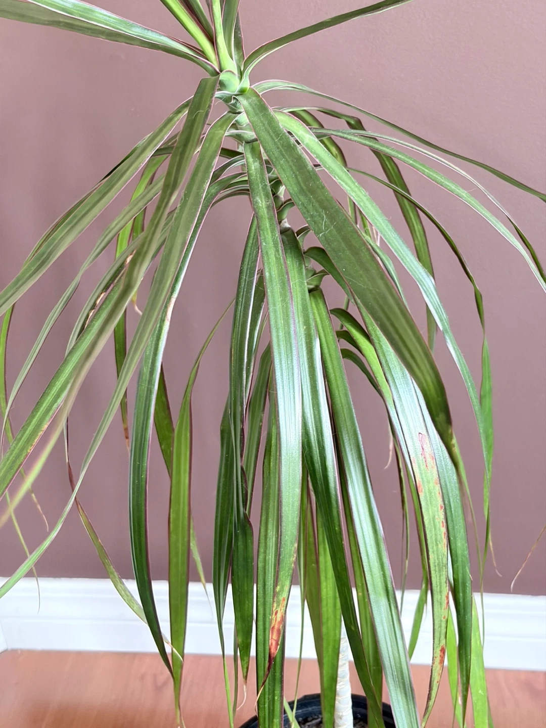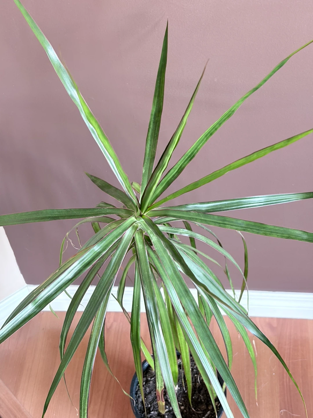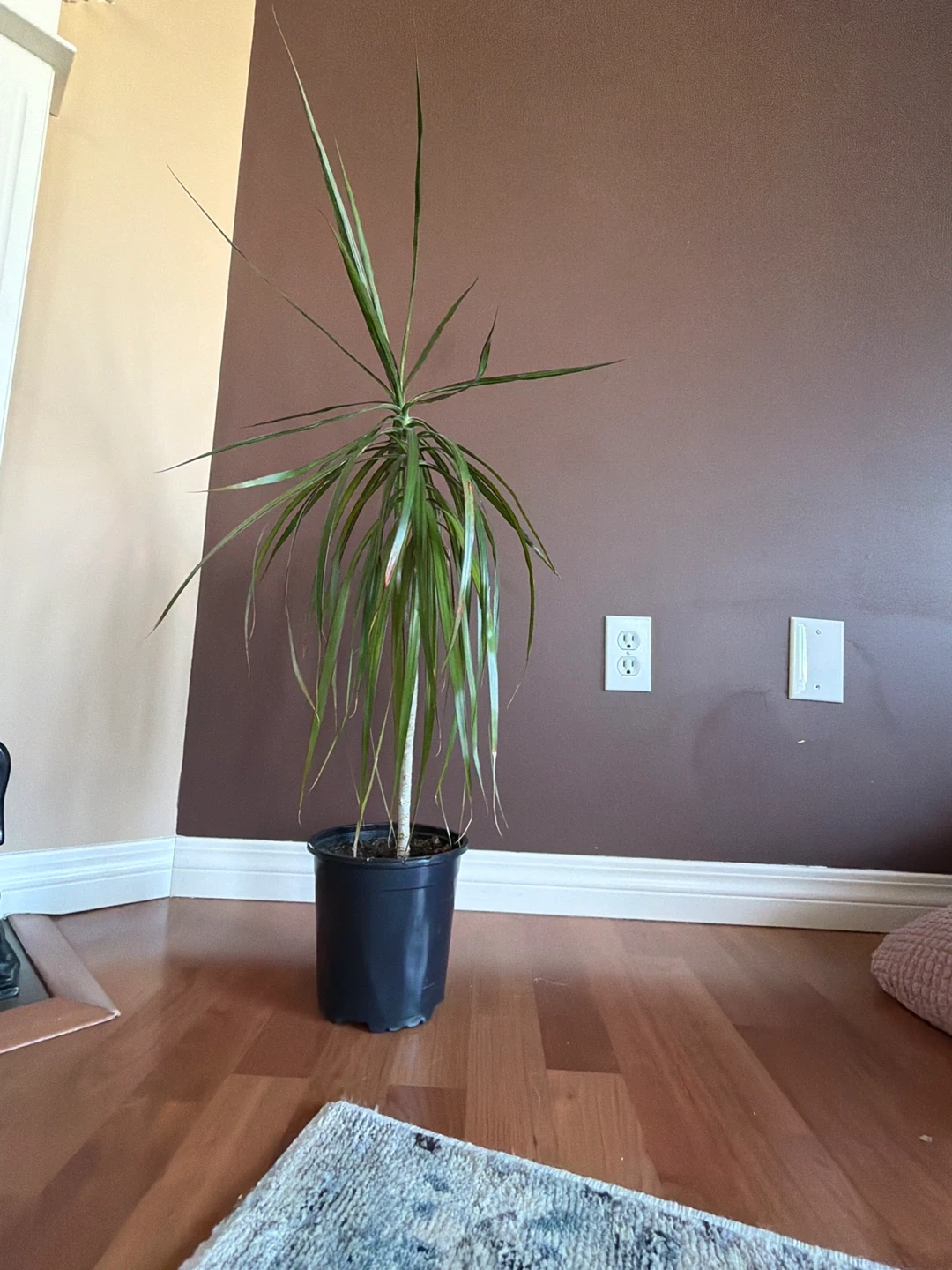 A Dracaena Fragrans 'Massangeana' plant in a black plastic pot. It's 3’ tall with pot. The actual plant is 29” tall. Some leaves are browned, it’s been too close to heat register and my cat loves to play with the leaves. browning. Transplanted to current pot last summer. Pot is 7” across. Healthy, just needs a better home. It's a low-maintenance choice for adding greenery to your space!