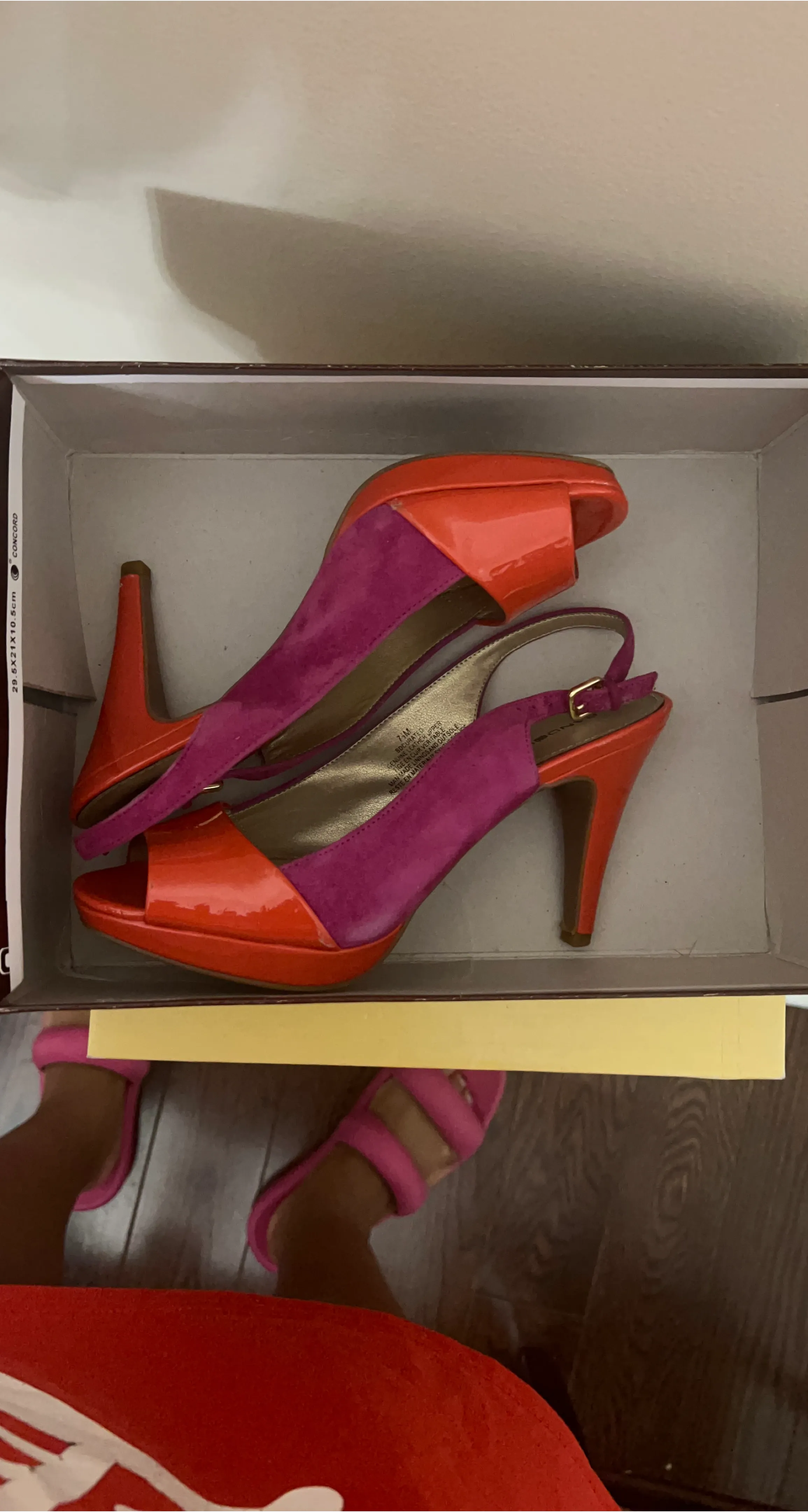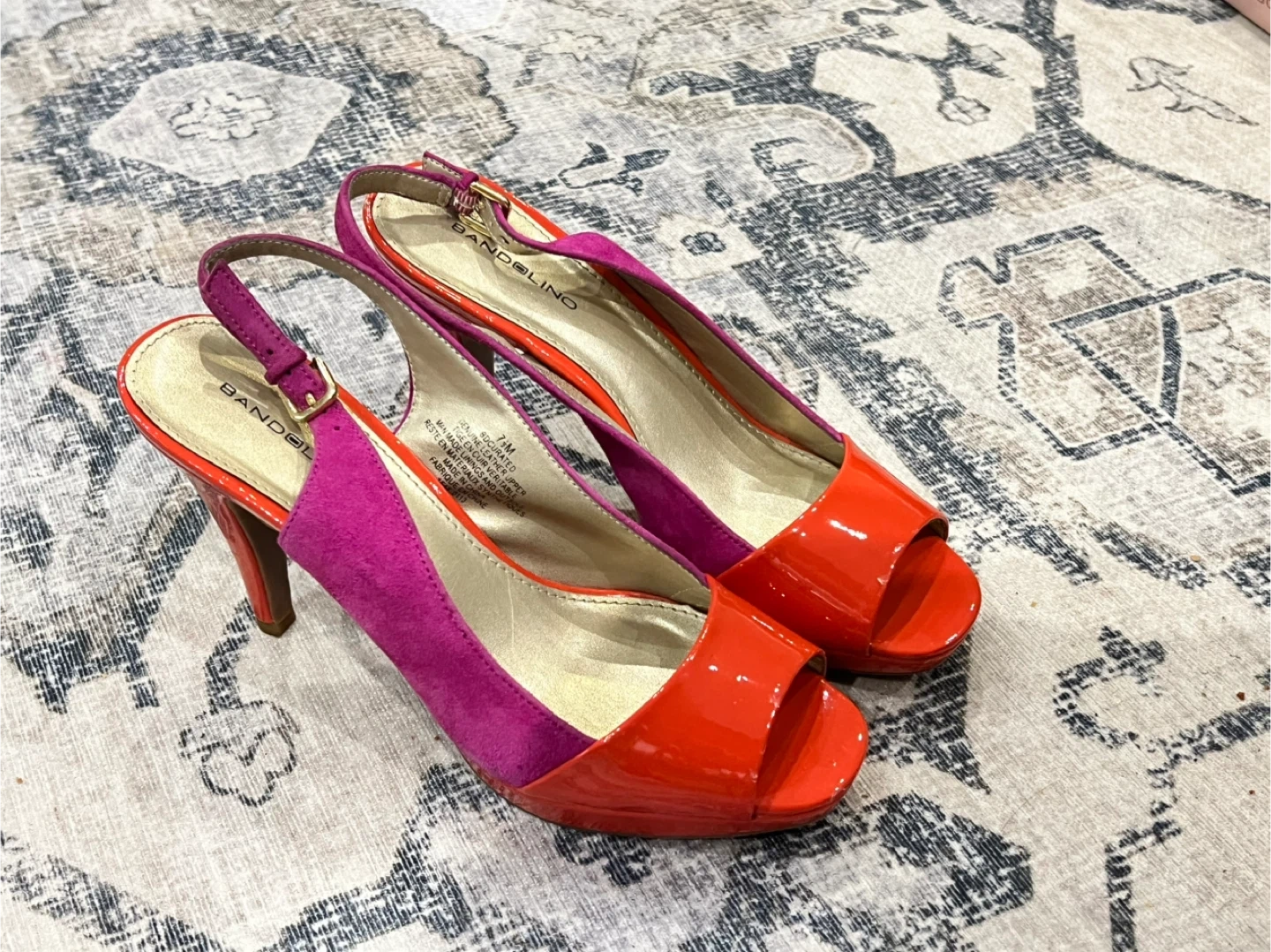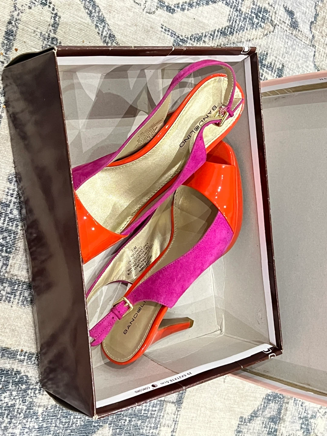 These Bandolino slingback heels come in a vibrant orange and pink colour combo. They're a size 7 medium, with a patent toe and suede straps. Includes original box!