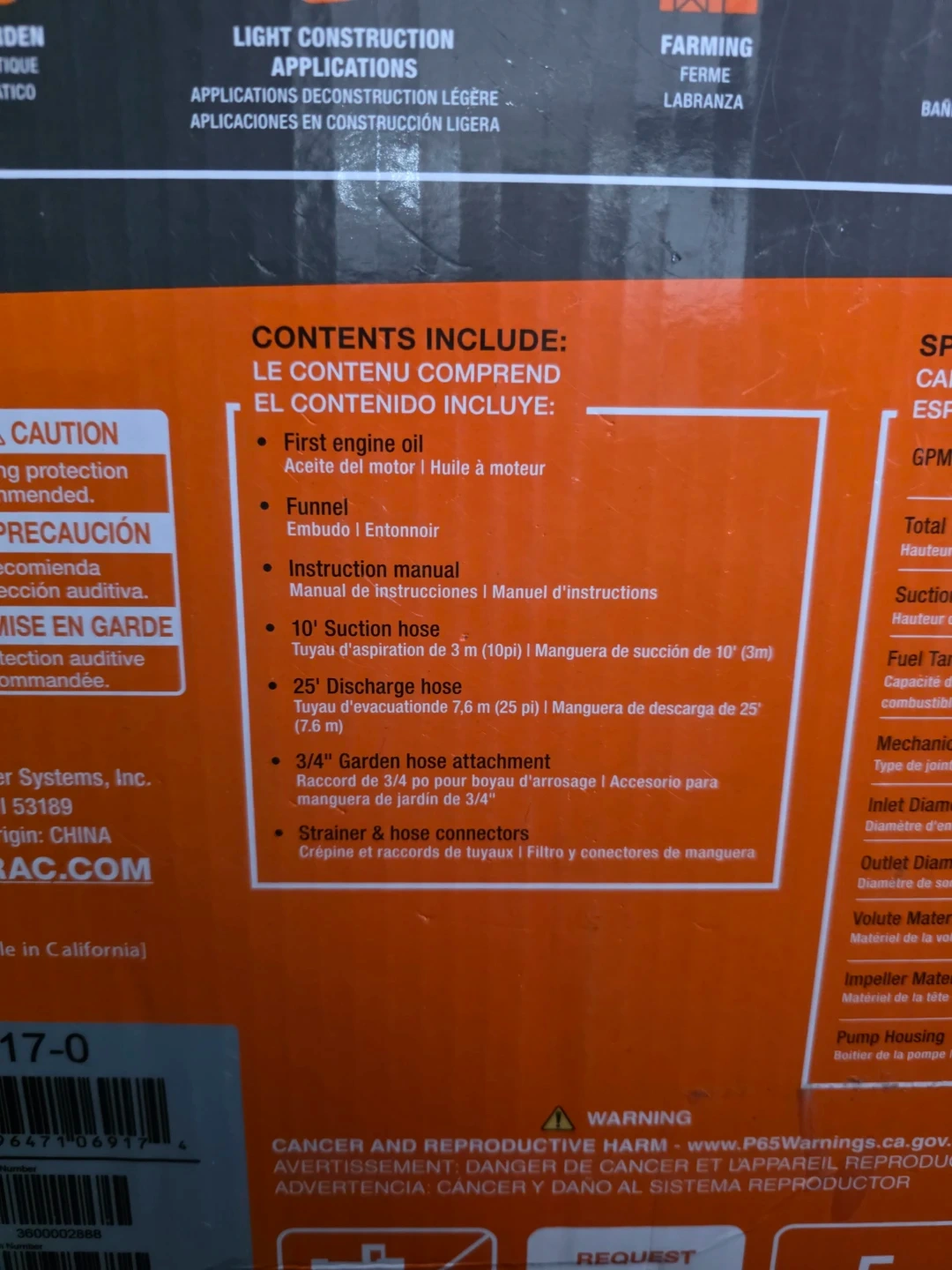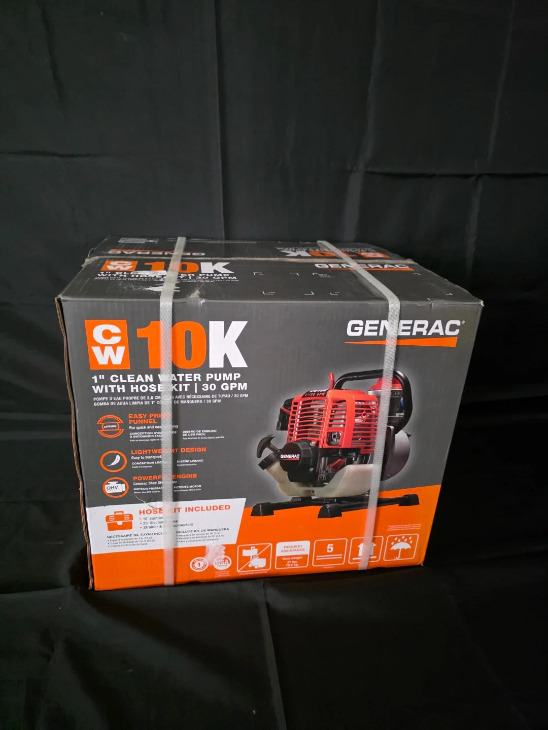This Generac water pump delivers 30 GPM (114 L per minute). It features a 1" NPT inlet and outlet. Includes a 10' suction hose and a 25' discharge hose. Brand new in sealed box. Asking 260.00 firm.