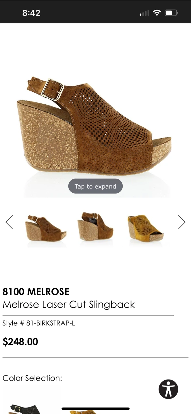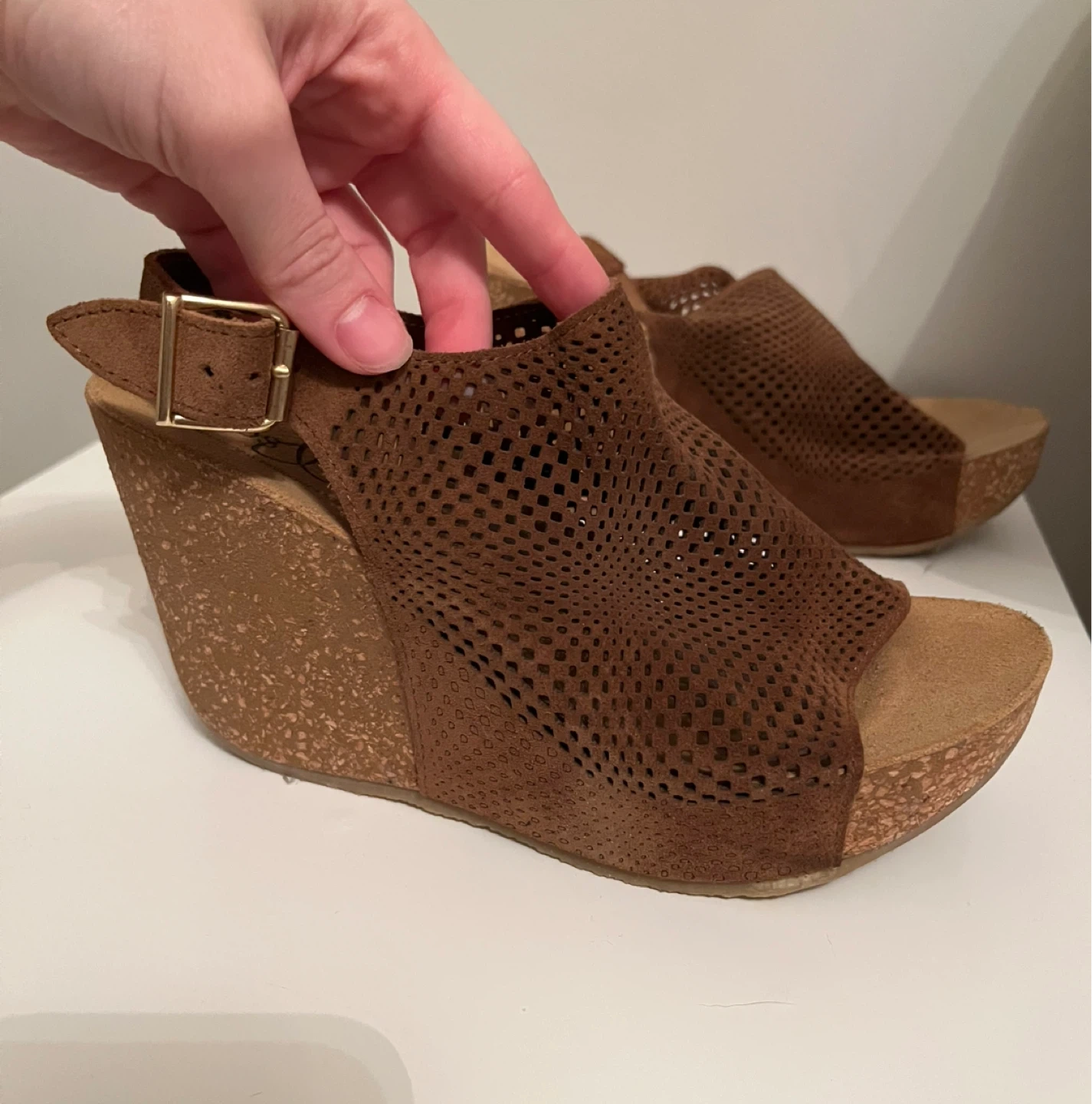 Stylish Bogs & Co. wedge sandals in a rich brown hue. These feature a cool perforated design with an adjustable ankle strap for a secure fit. Made in Italy and size 37.