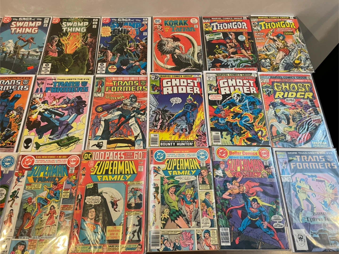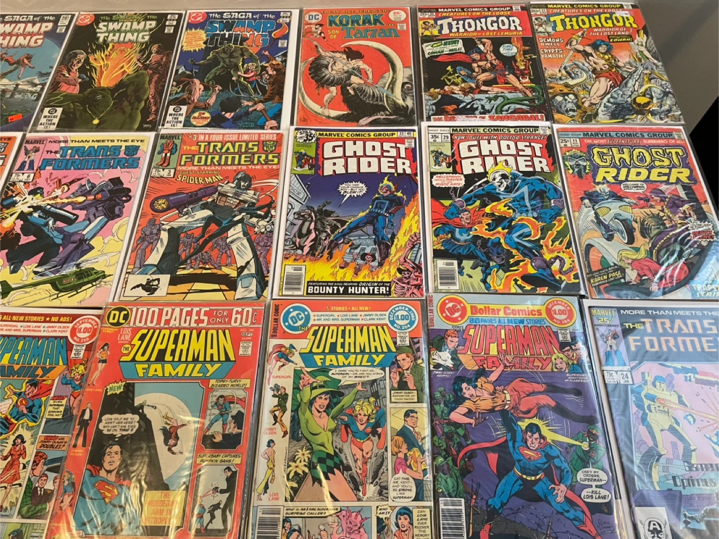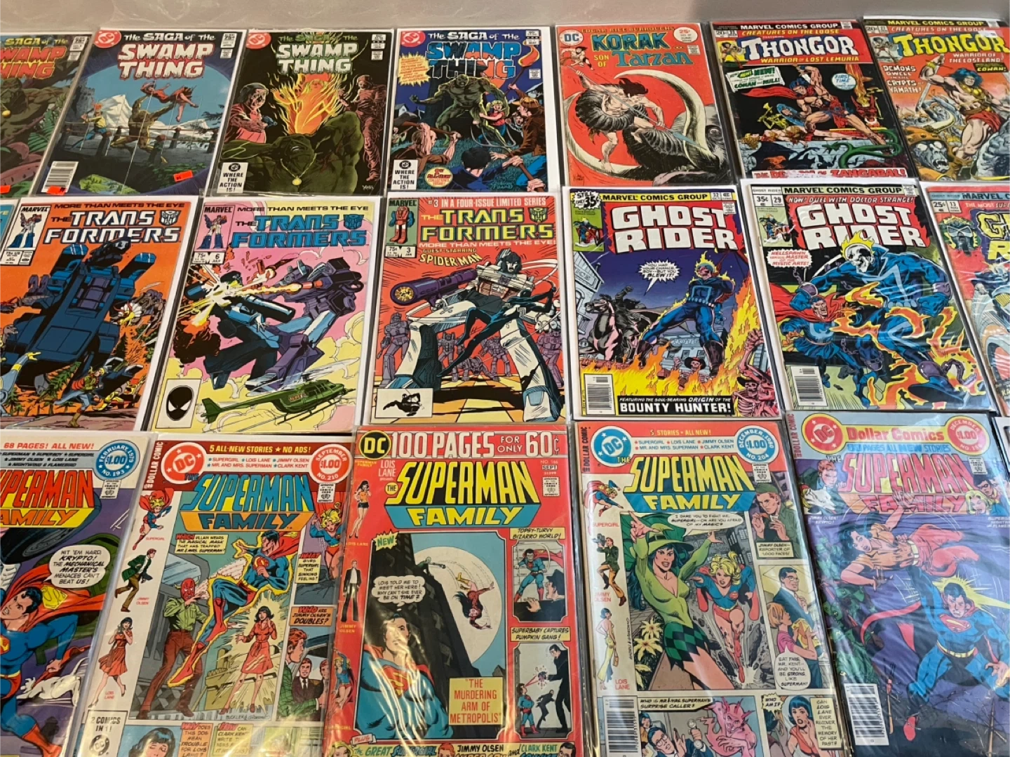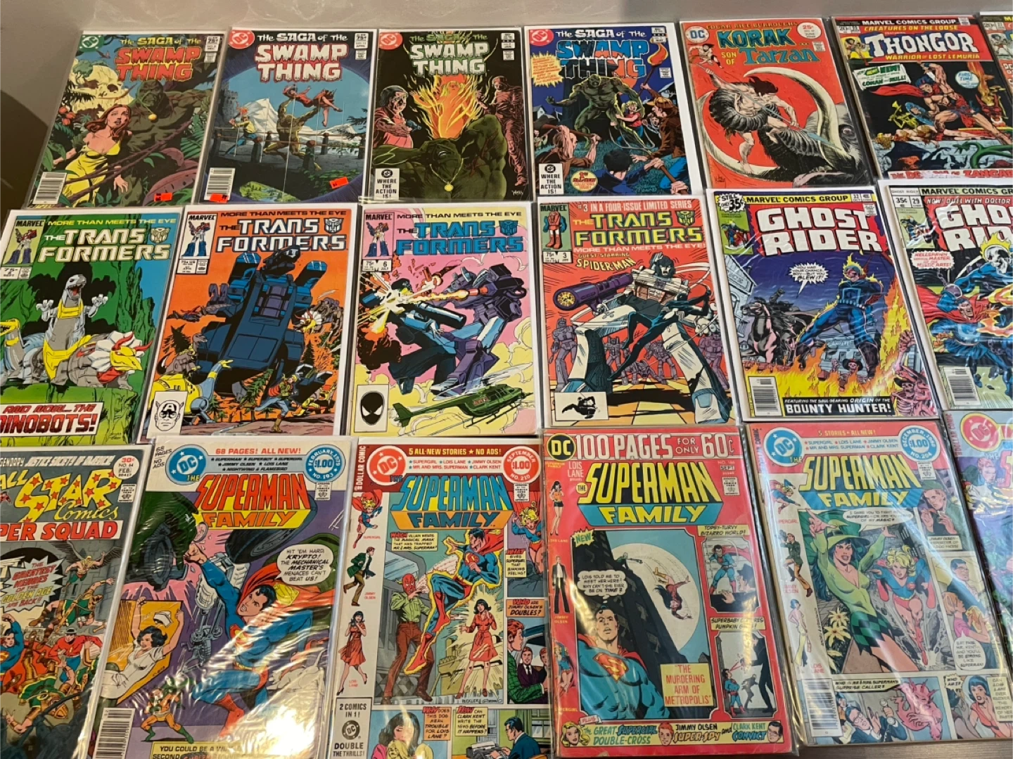 This lot includes various comic books from DC Comics and Marvel Comics. You'll find titles like The Saga of the Swamp Thing, Korak Son of Tarzan, Thongor, The Transformers, Ghost Rider, Superman Family, and All-Star Super Squad. These comics are from the 1970s and 1980s. They're great additions for any comic collector! 60$