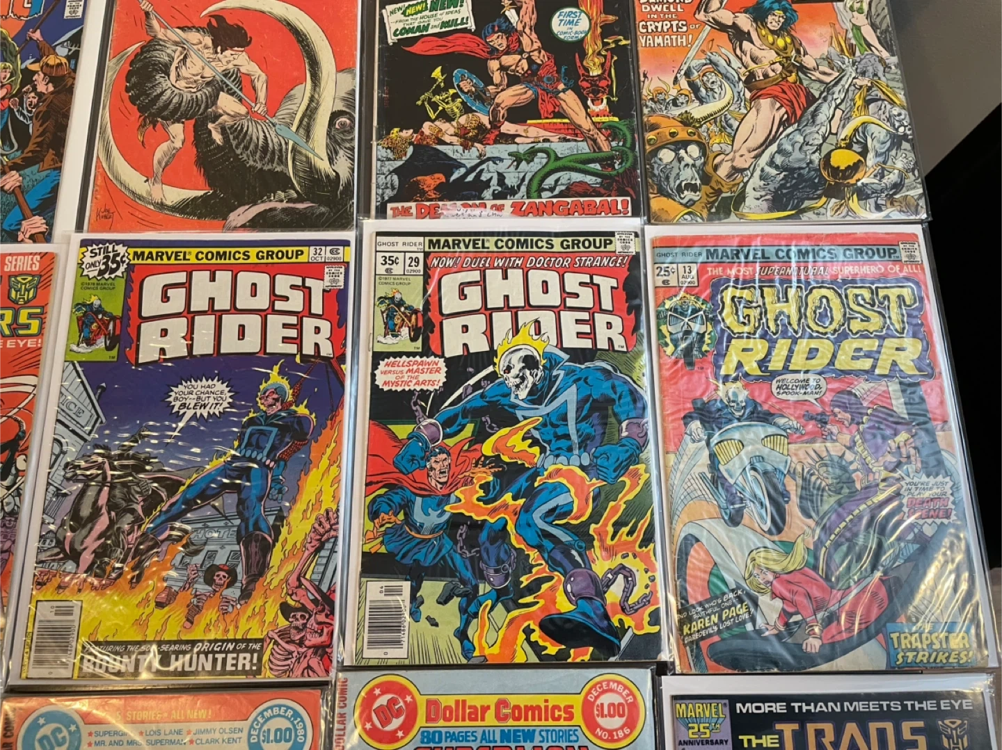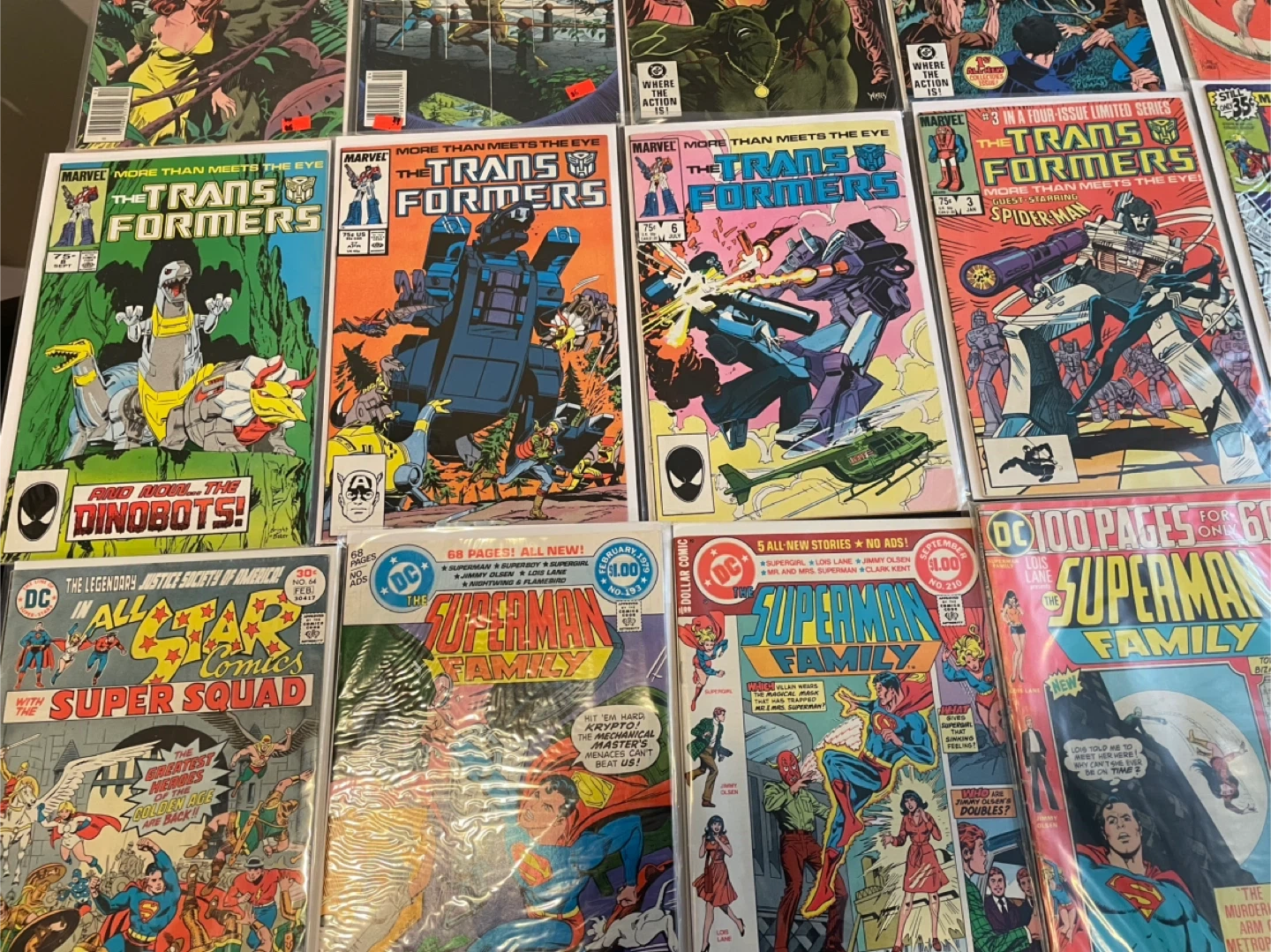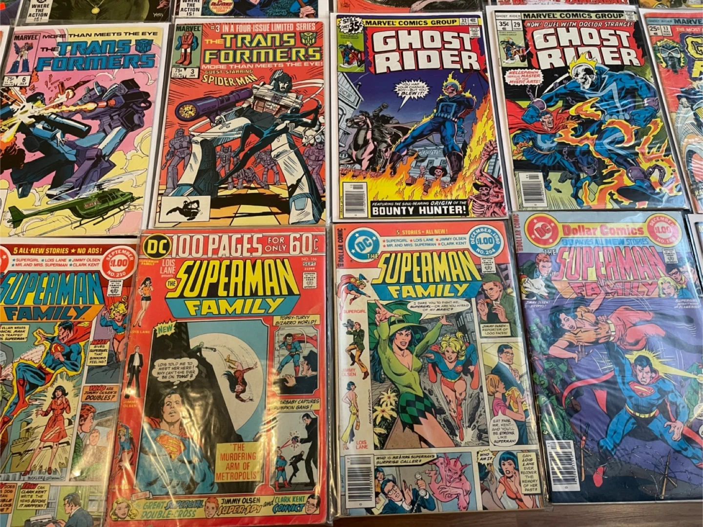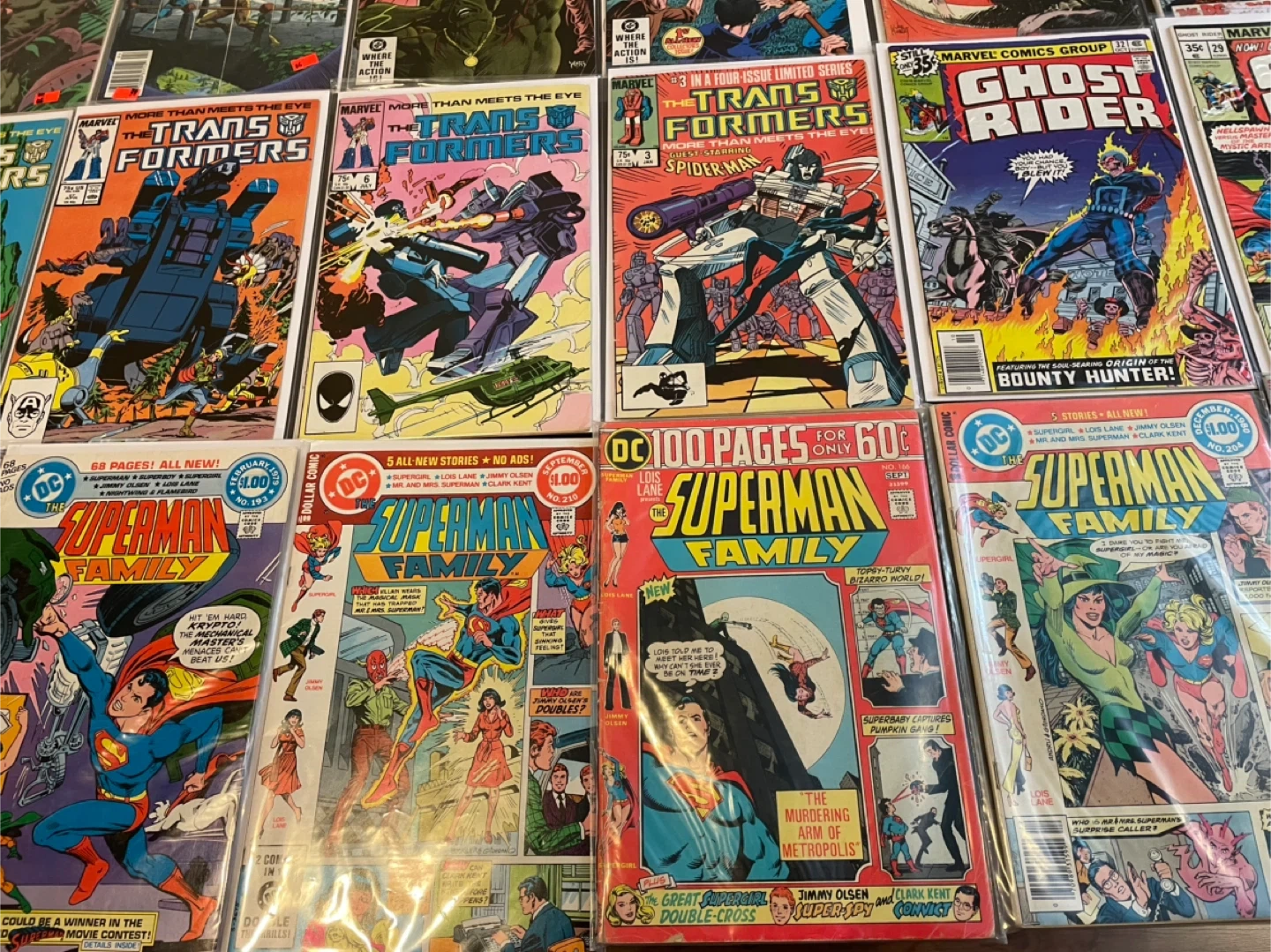 This lot includes various comic books from DC Comics and Marvel Comics. You'll find titles like The Saga of the Swamp Thing, Korak Son of Tarzan, Thongor, The Transformers, Ghost Rider, Superman Family, and All-Star Super Squad. These comics are from the 1970s and 1980s. They're great additions for any comic collector! 60$
