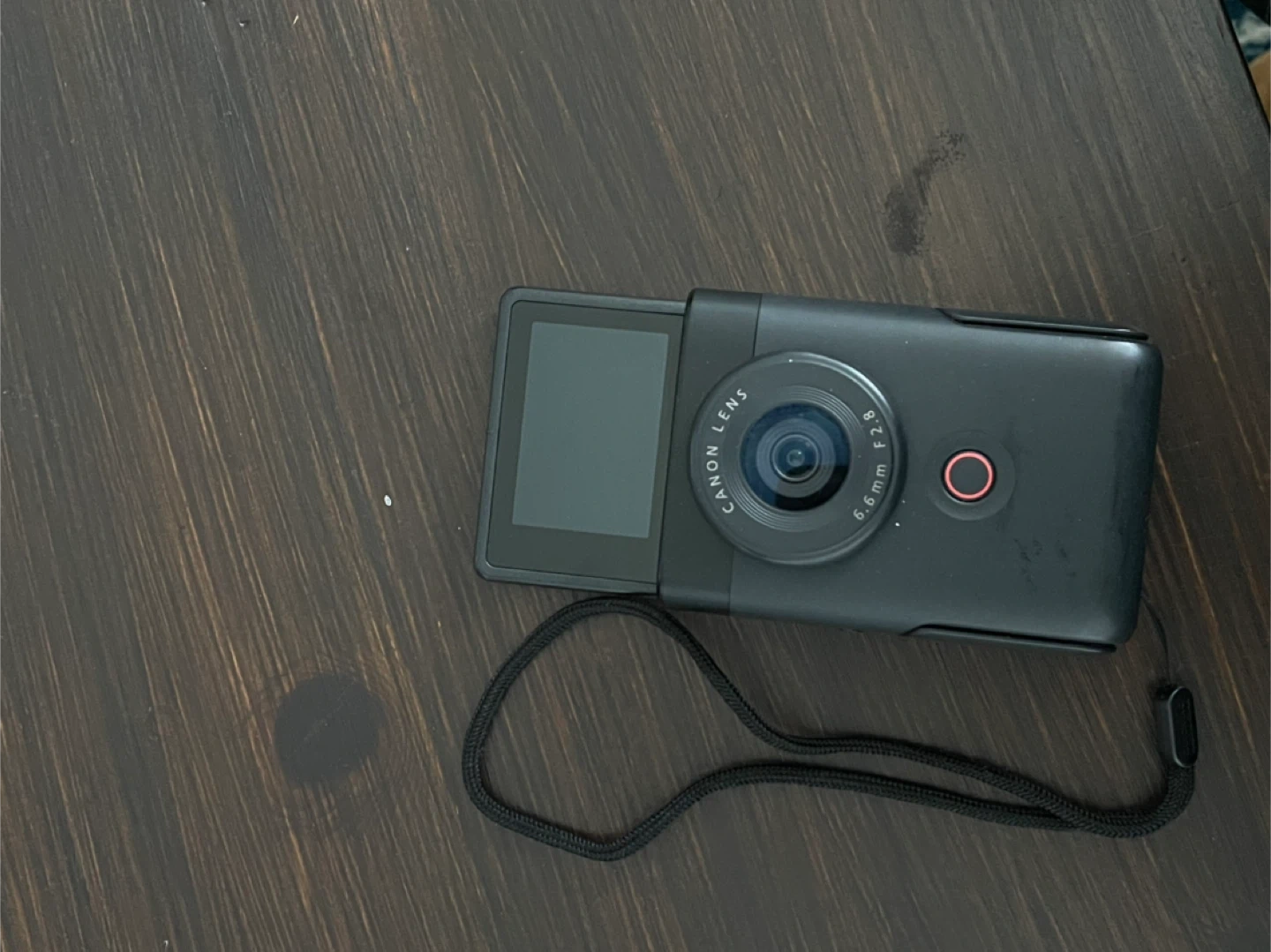 This is a black Canon PowerShot V10 video camera. It features a 6.6mm f/2.8 lens and a flip-up screen. Comes with a wrist strap. It's great for on the go videos. In amazing condition looking to sell as soon as.