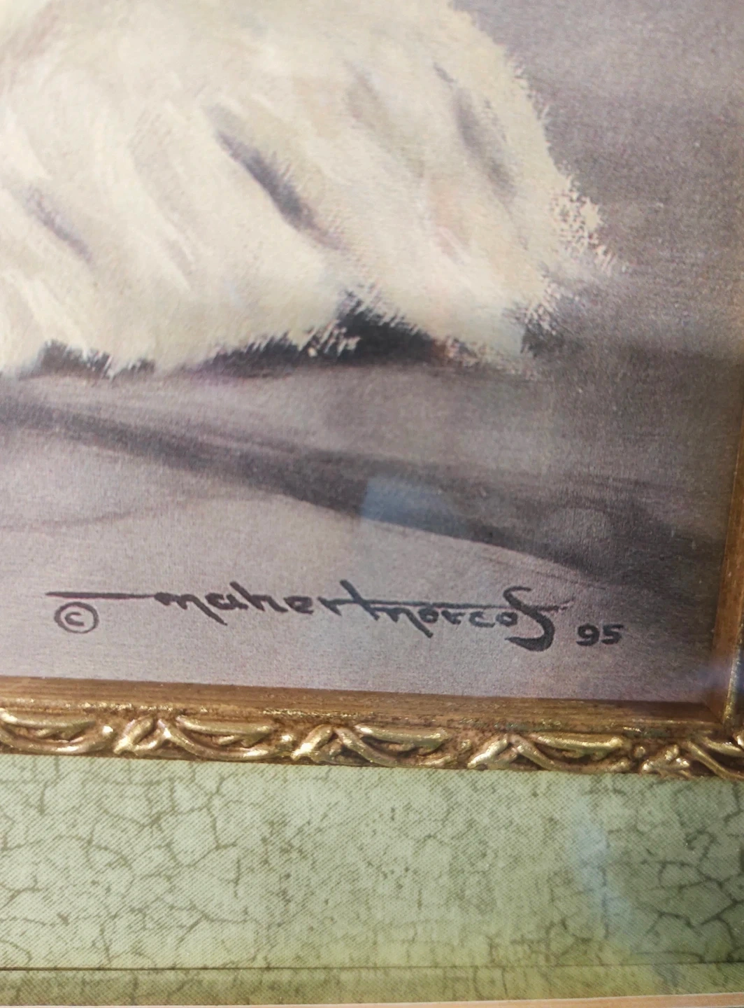 A framed art print titled "The Lion and the Woman" by Maher Morcos, dated 1995. The artwork depicts a woman reclining on a lion with Egyptian hieroglyphs in the background. It's housed in a decorative gold-toned frame.