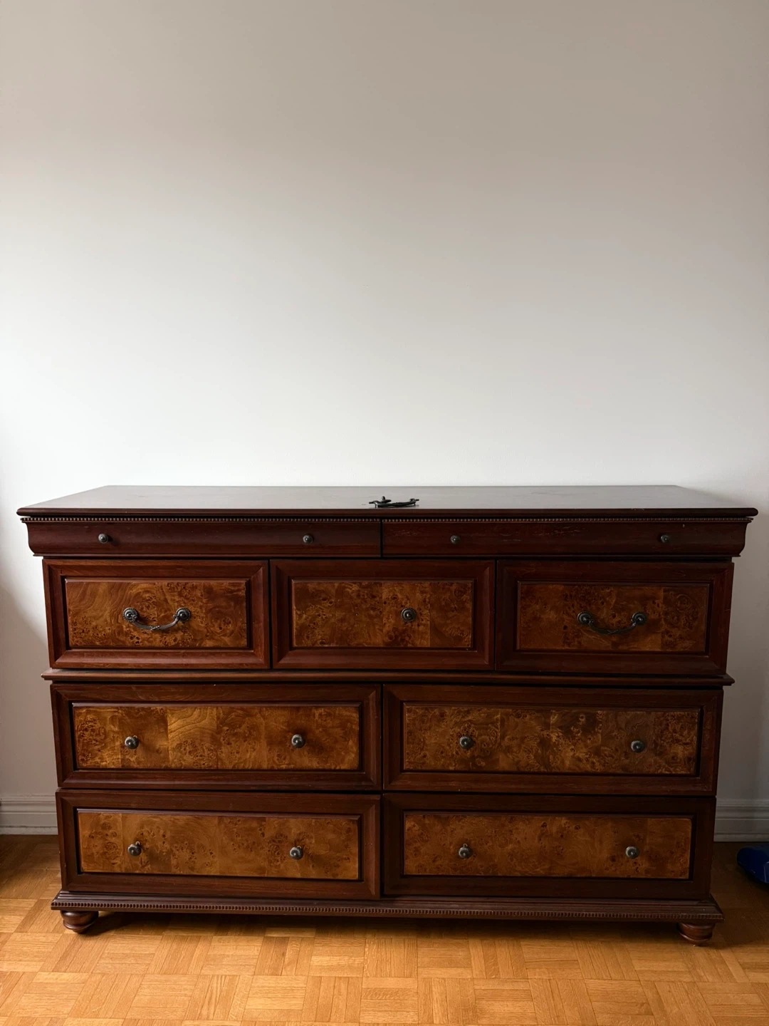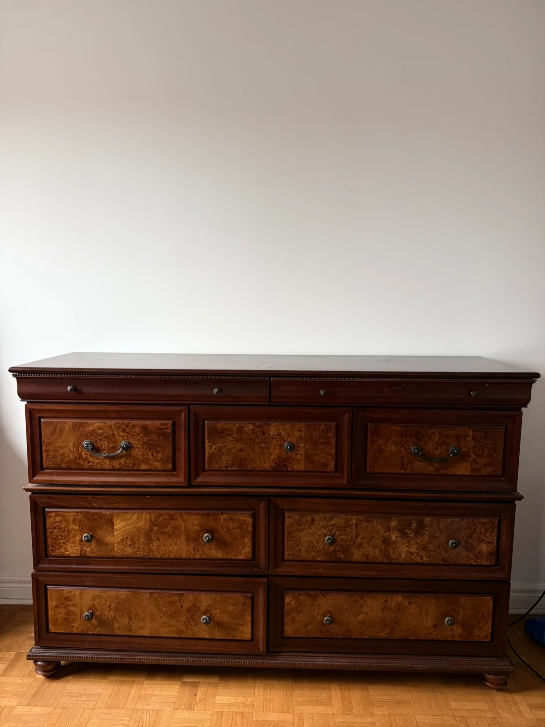 A beautiful wooden dresser featuring nine drawers with decorative wood inlay. This dresser offers ample storage space for your bedroom essentials. It's crafted from dark wood with ornate drawer pulls, adding a classic touch to any room.
